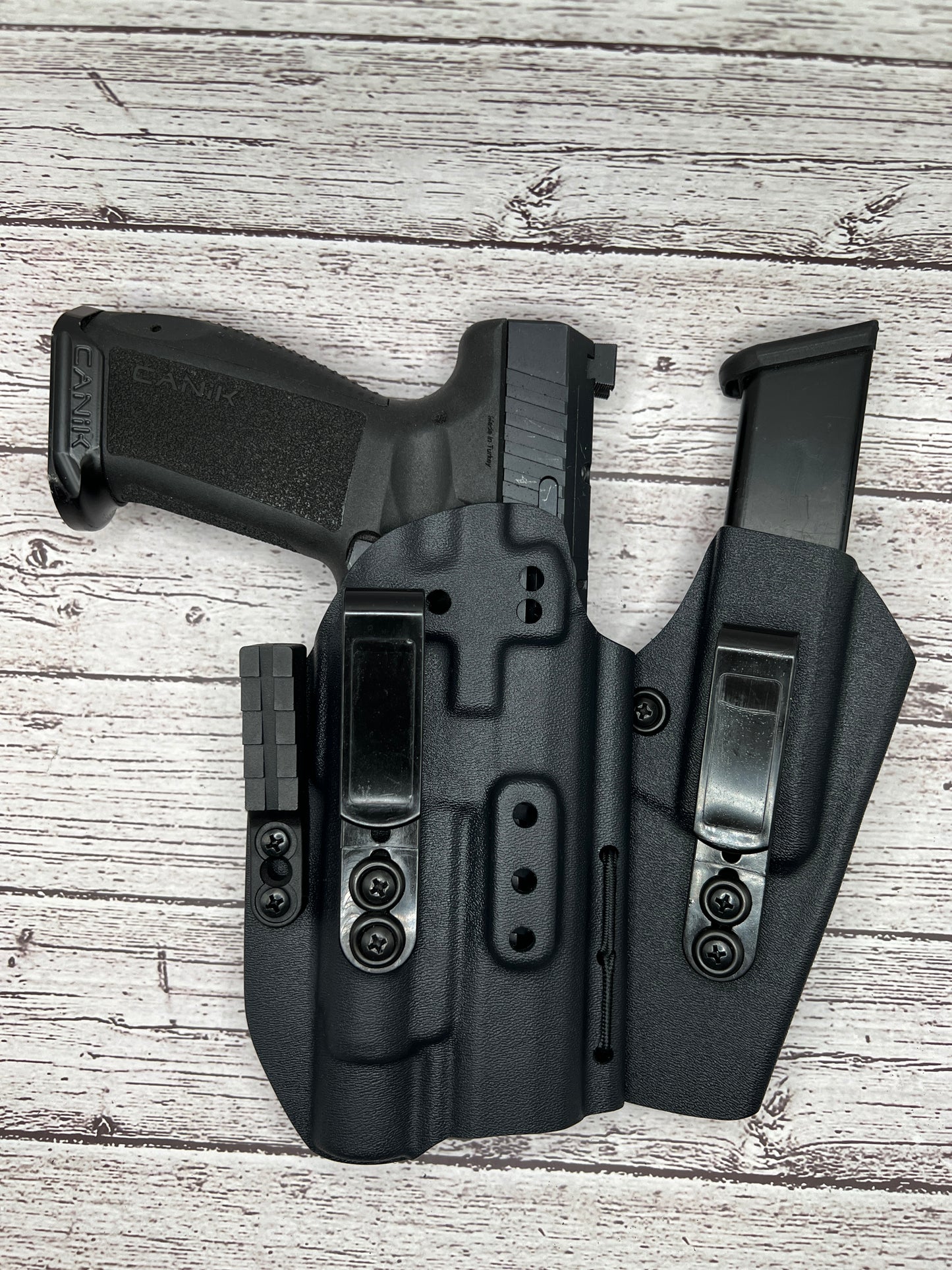 A Canik IWB Kydex holster is a holster specifically designed to fit the Canik pistol and worn inside the waistband of the pants, made from Kydex material to provide a durable and secure fit for concealed carry.