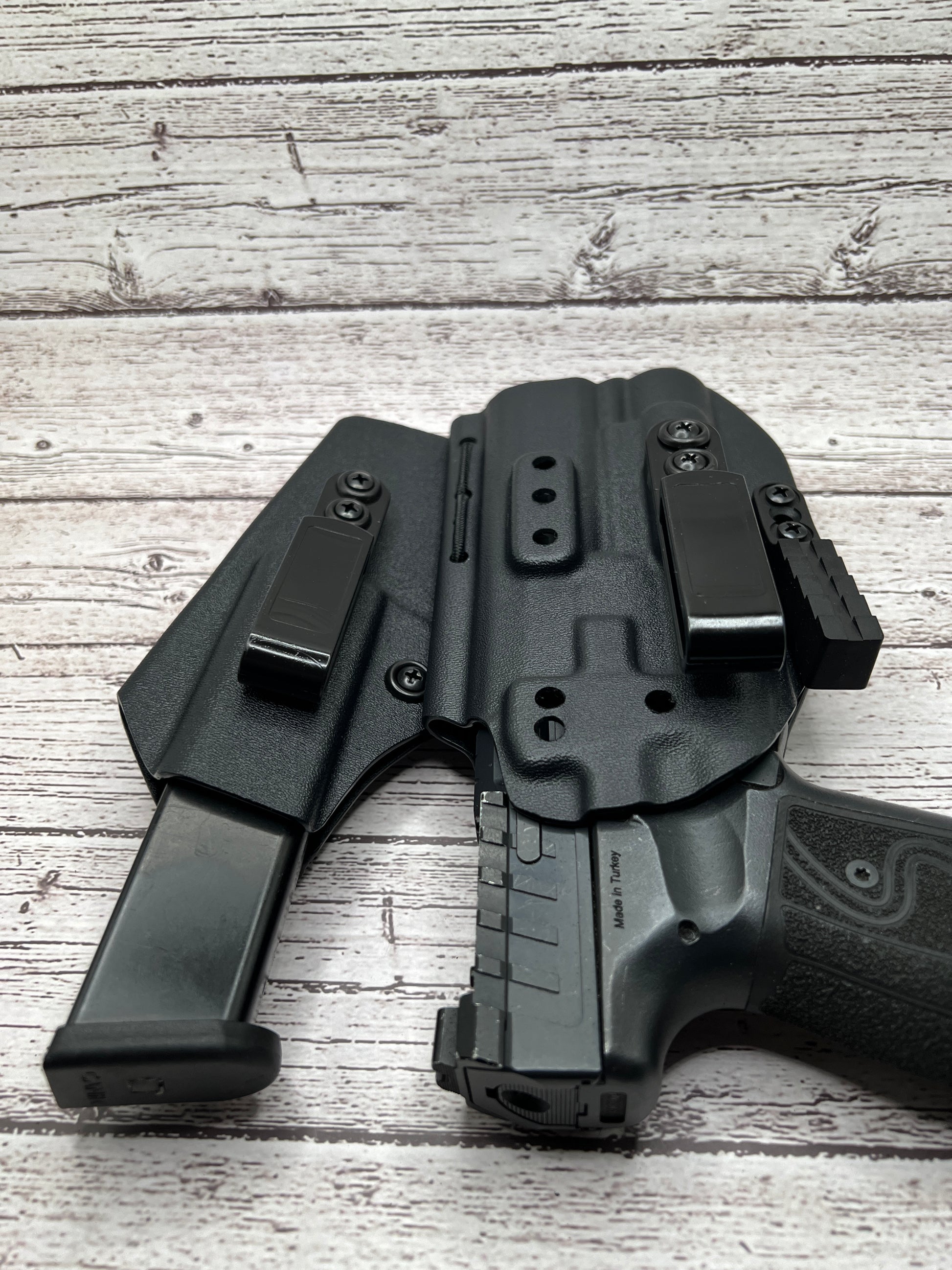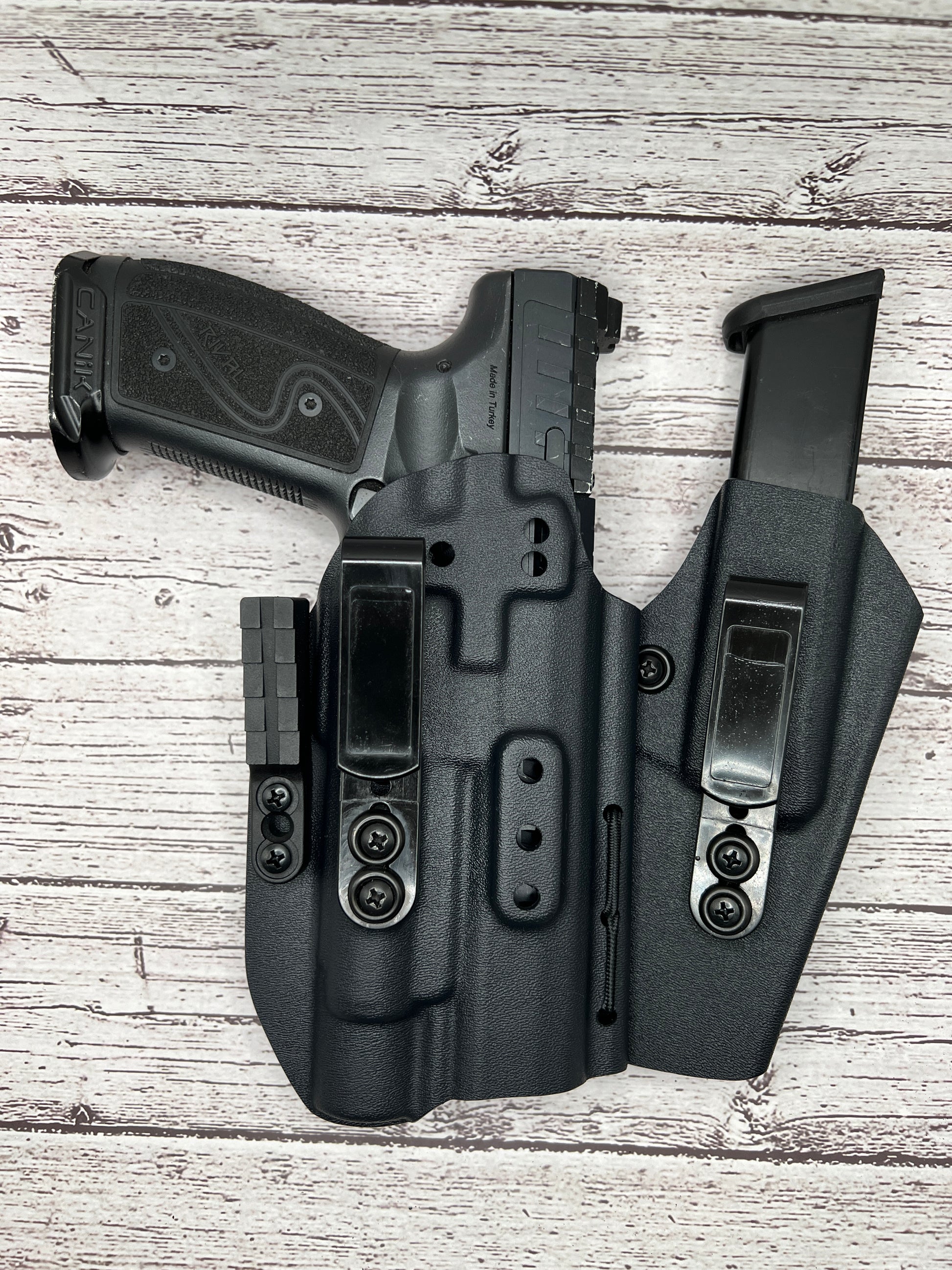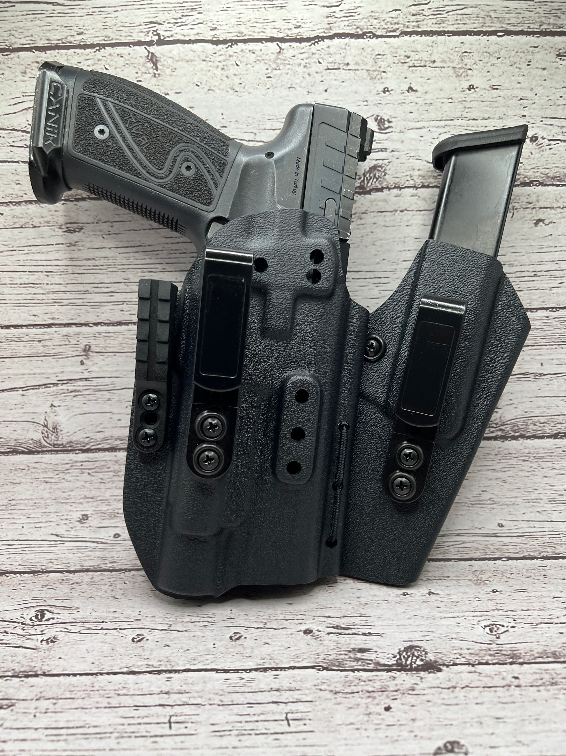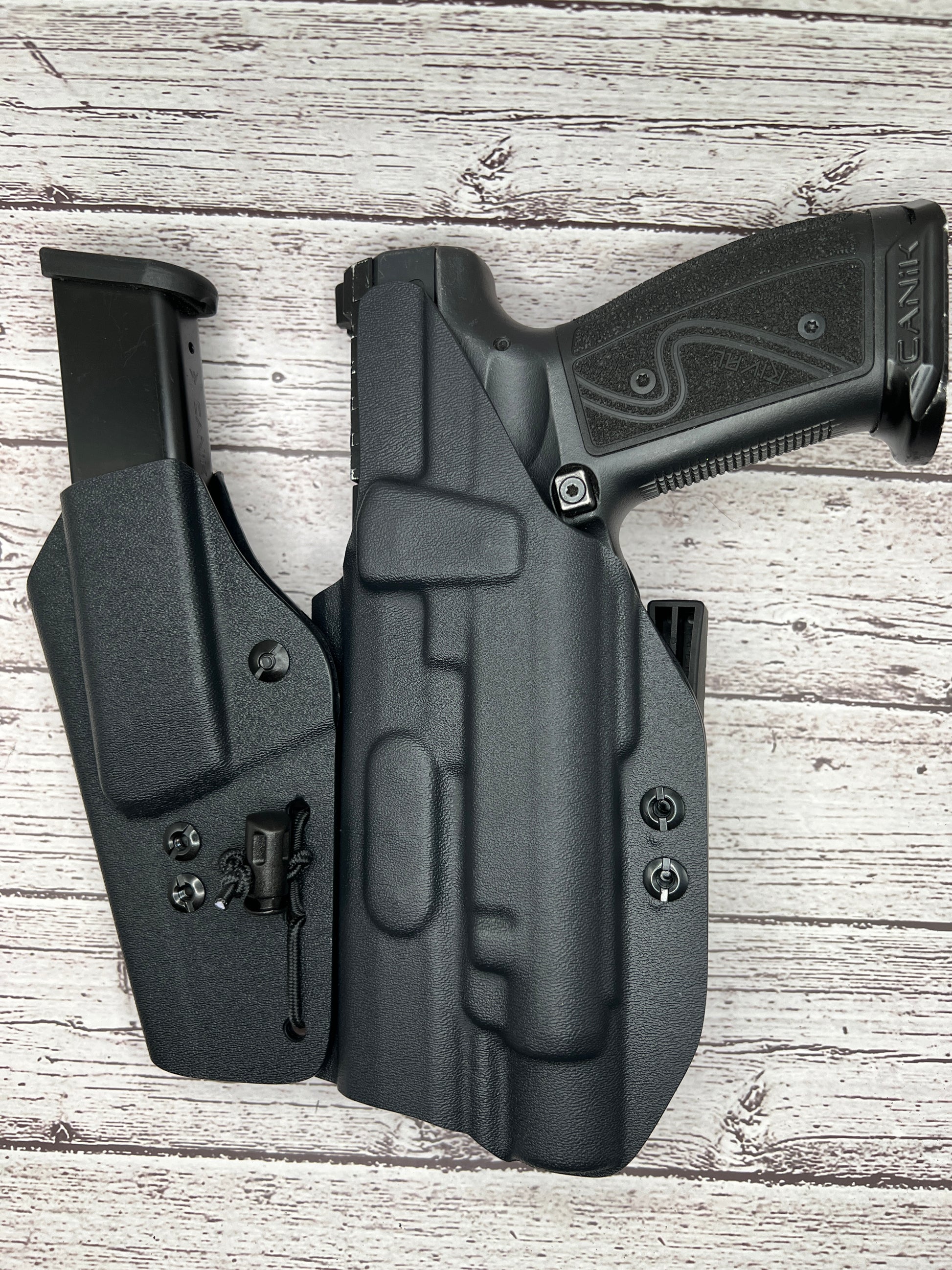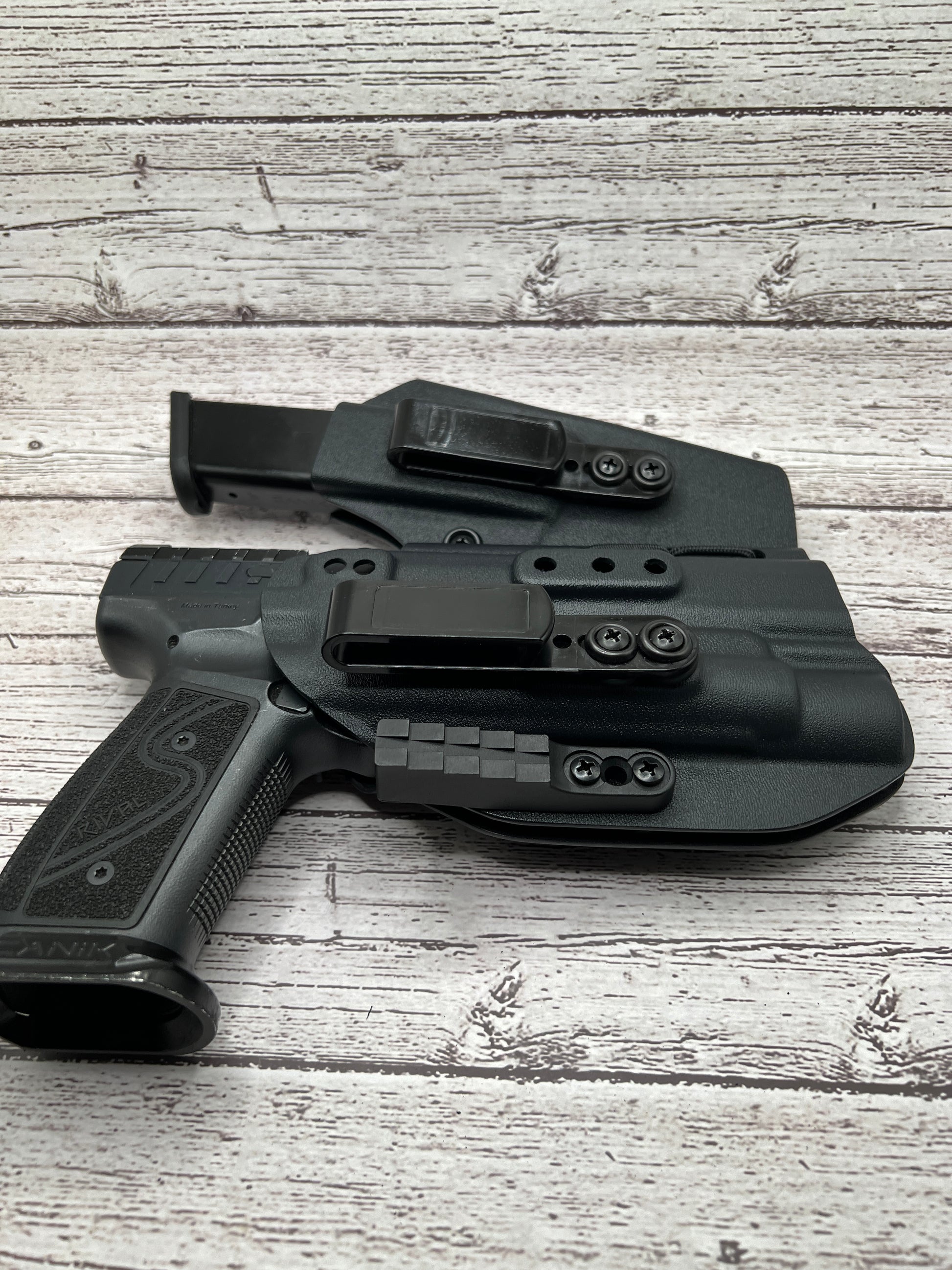 A Canik IWB Kydex holster is a holster specifically designed to fit the Canik pistol and worn inside the waistband of the pants, made from Kydex material to provide a durable and secure fit for concealed carry.