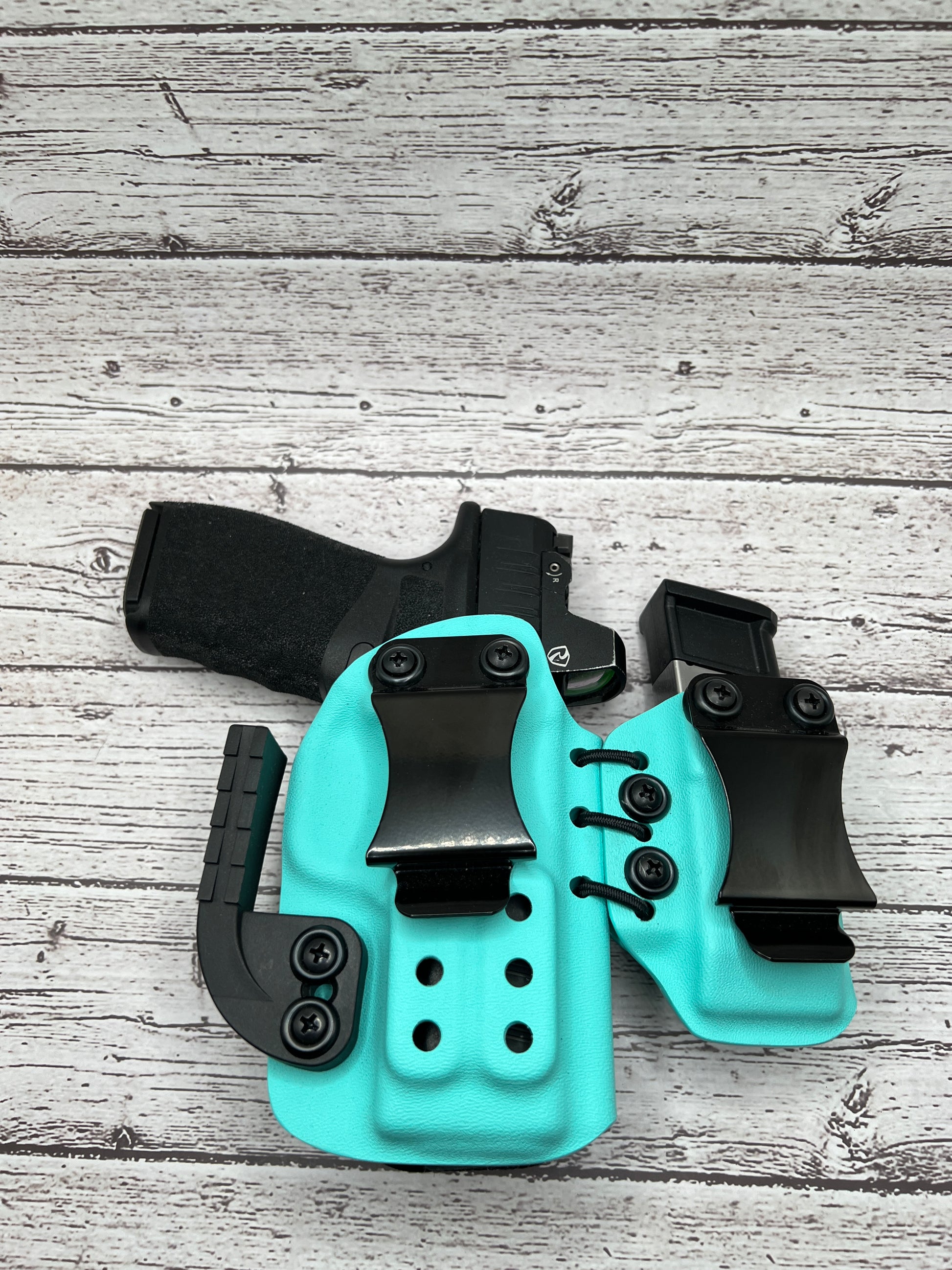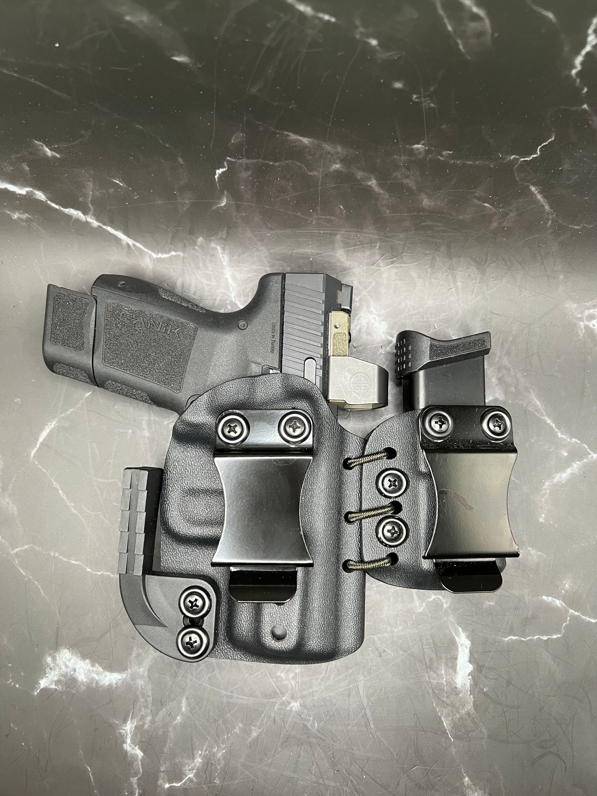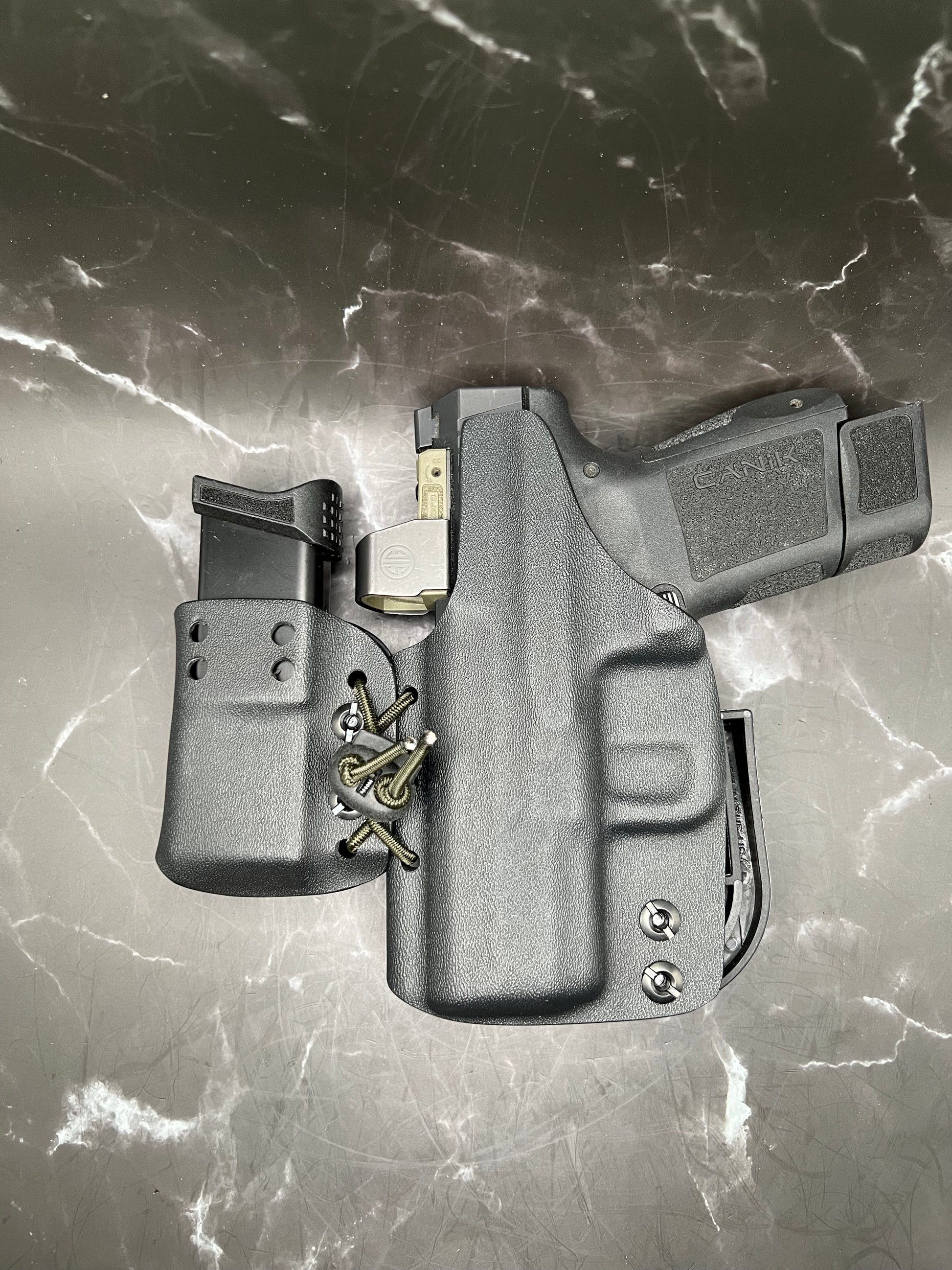 A Kydex holster is made from a thermoplastic material that is durable, lightweight, and custom-molded to fit the specific shape of the CANIK - GLOCK - SIG SAUER - H&K. Kydex holsters are known for their durability, retention, and ease of use.