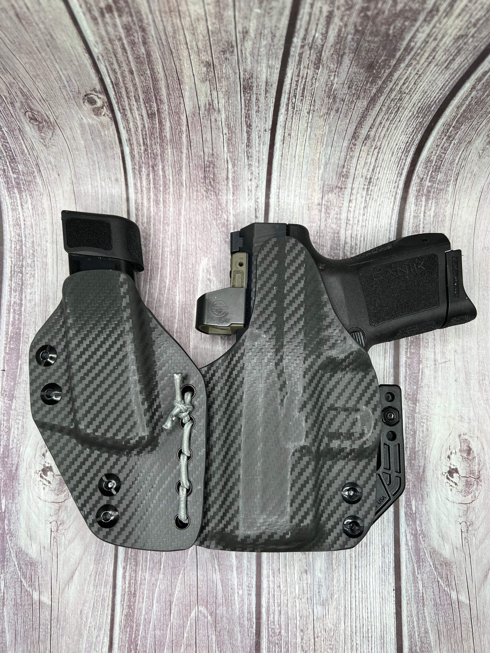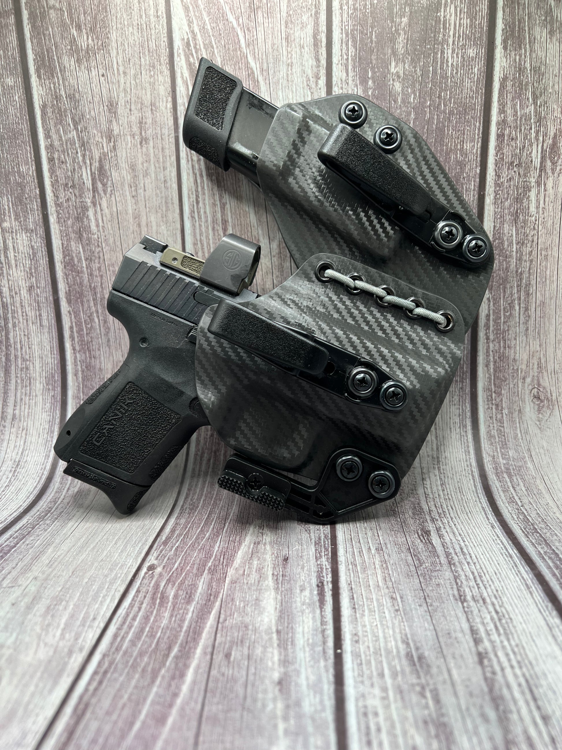A Kydex holster is made from a thermoplastic material that is durable, lightweight, and custom-molded to fit the specific shape of the CANIK. Kydex holsters are known for their durability, retention, and ease of use.