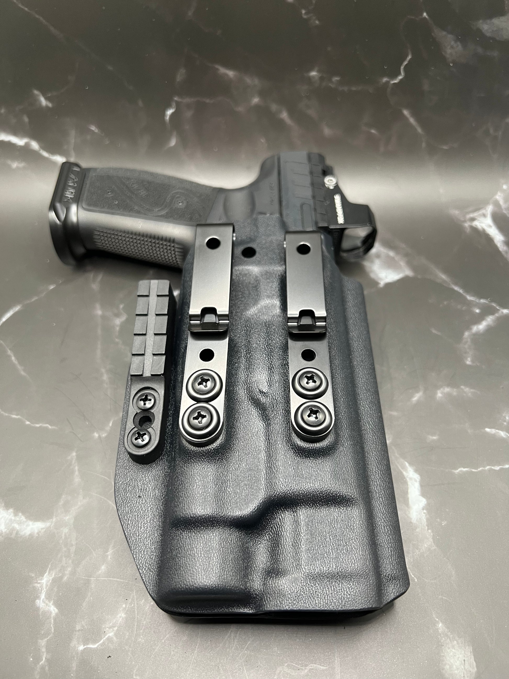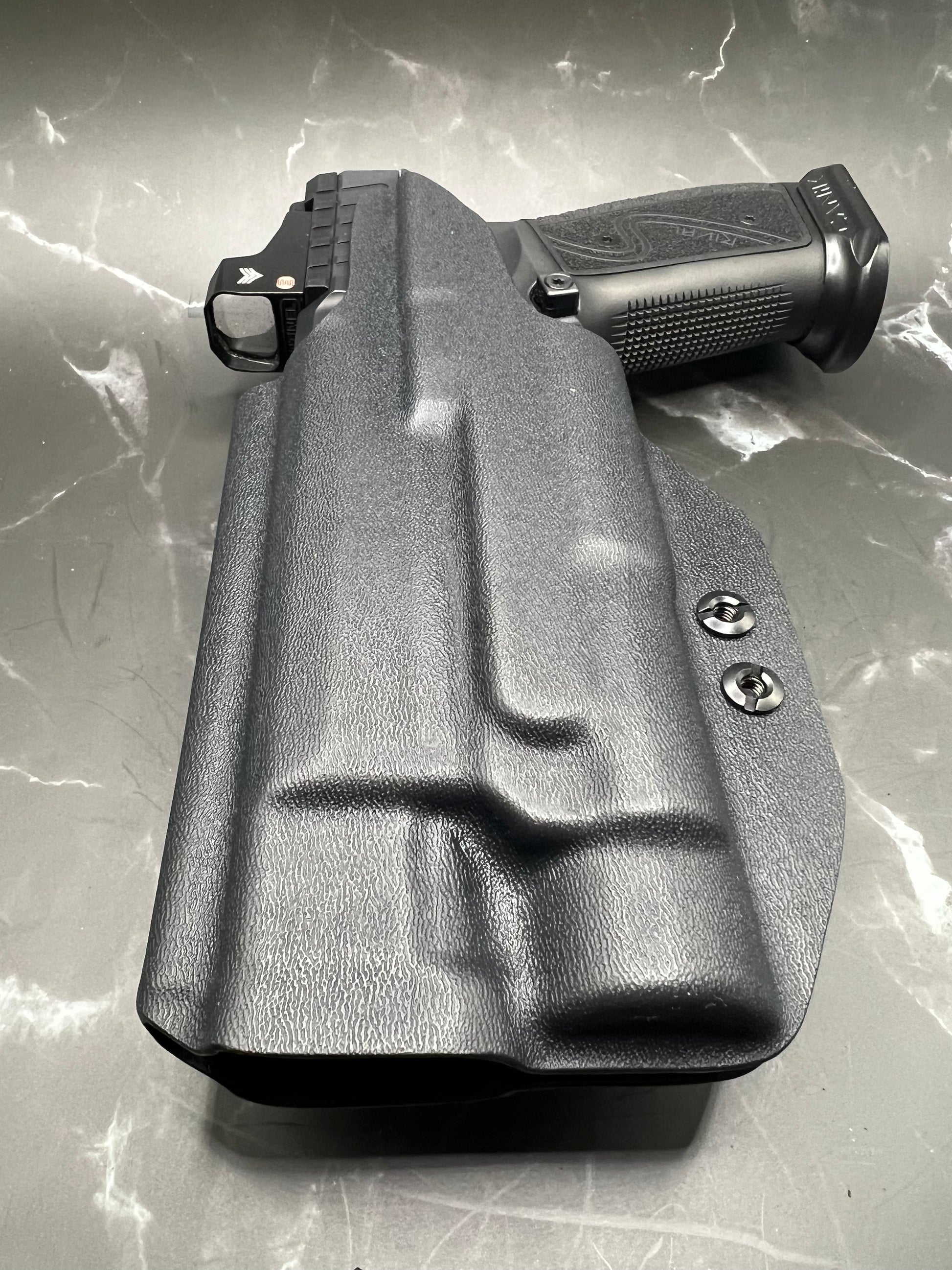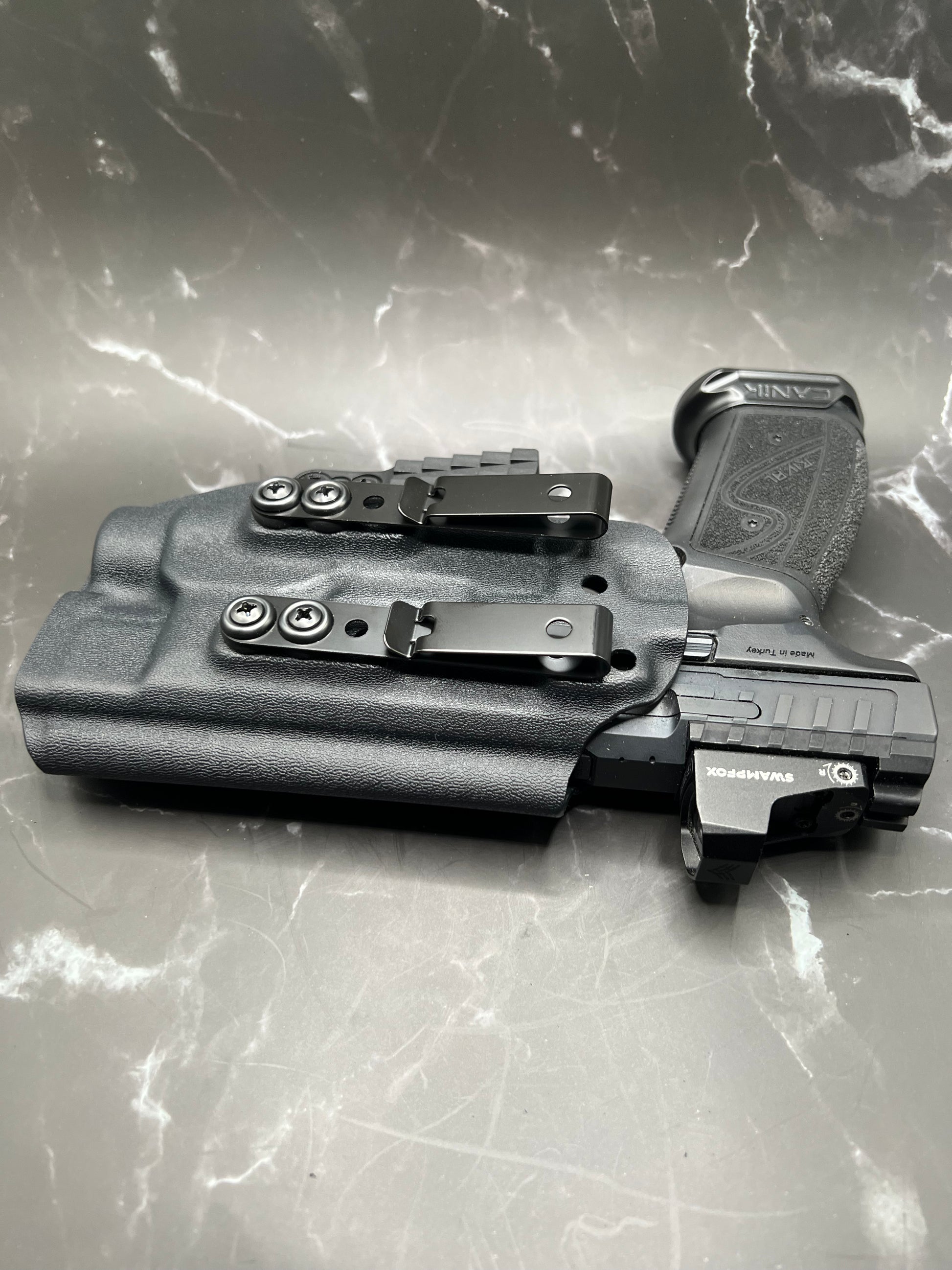 A Canik IWB Kydex holster is a holster specifically designed to fit the Canik pistol and worn inside the waistband of the pants, made from Kydex material to provide a durable and secure fit for concealed carry.