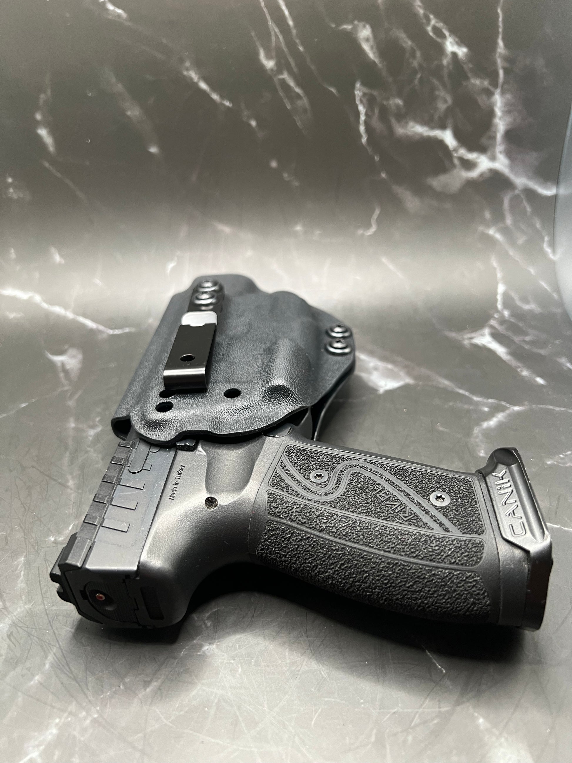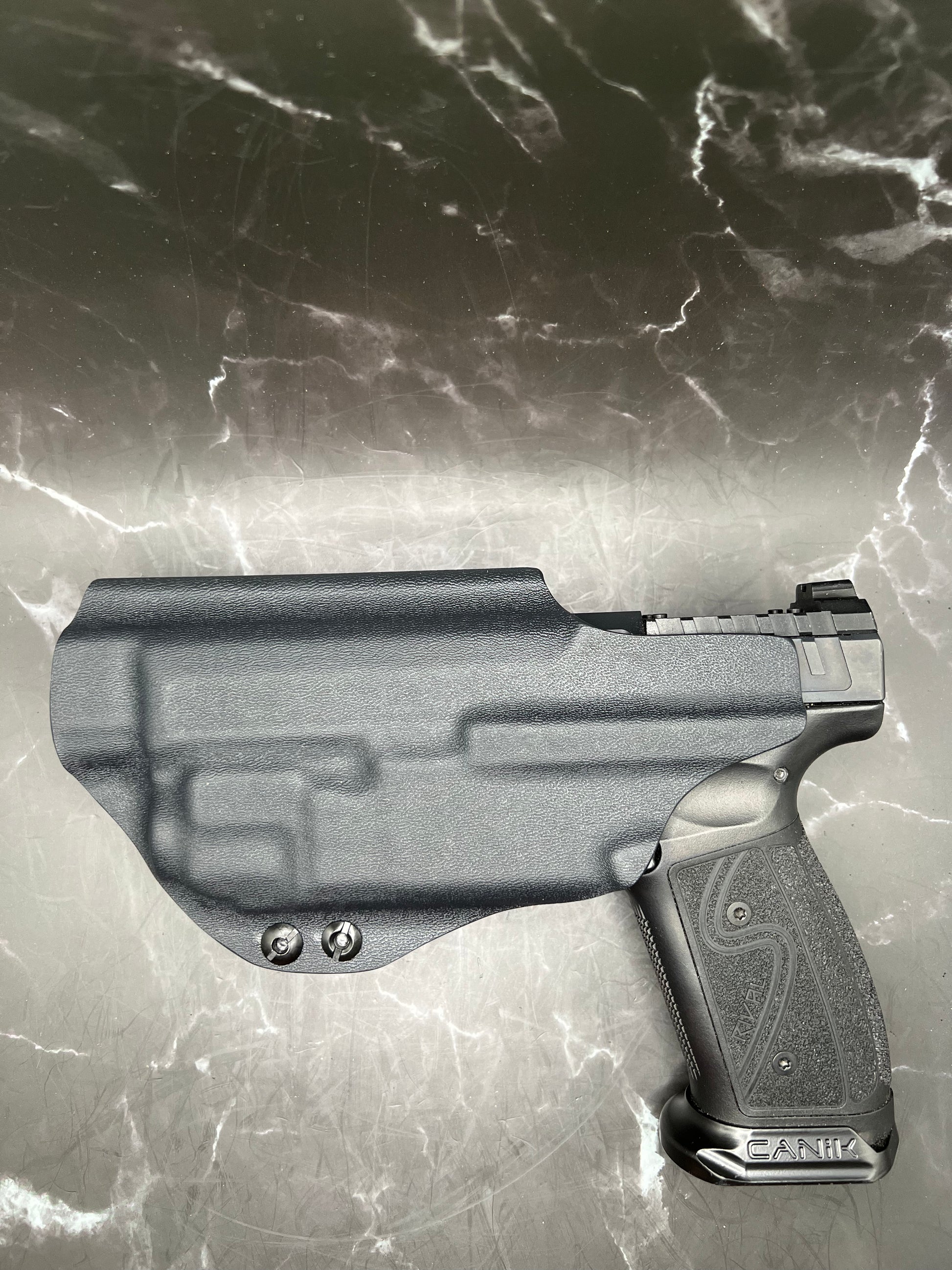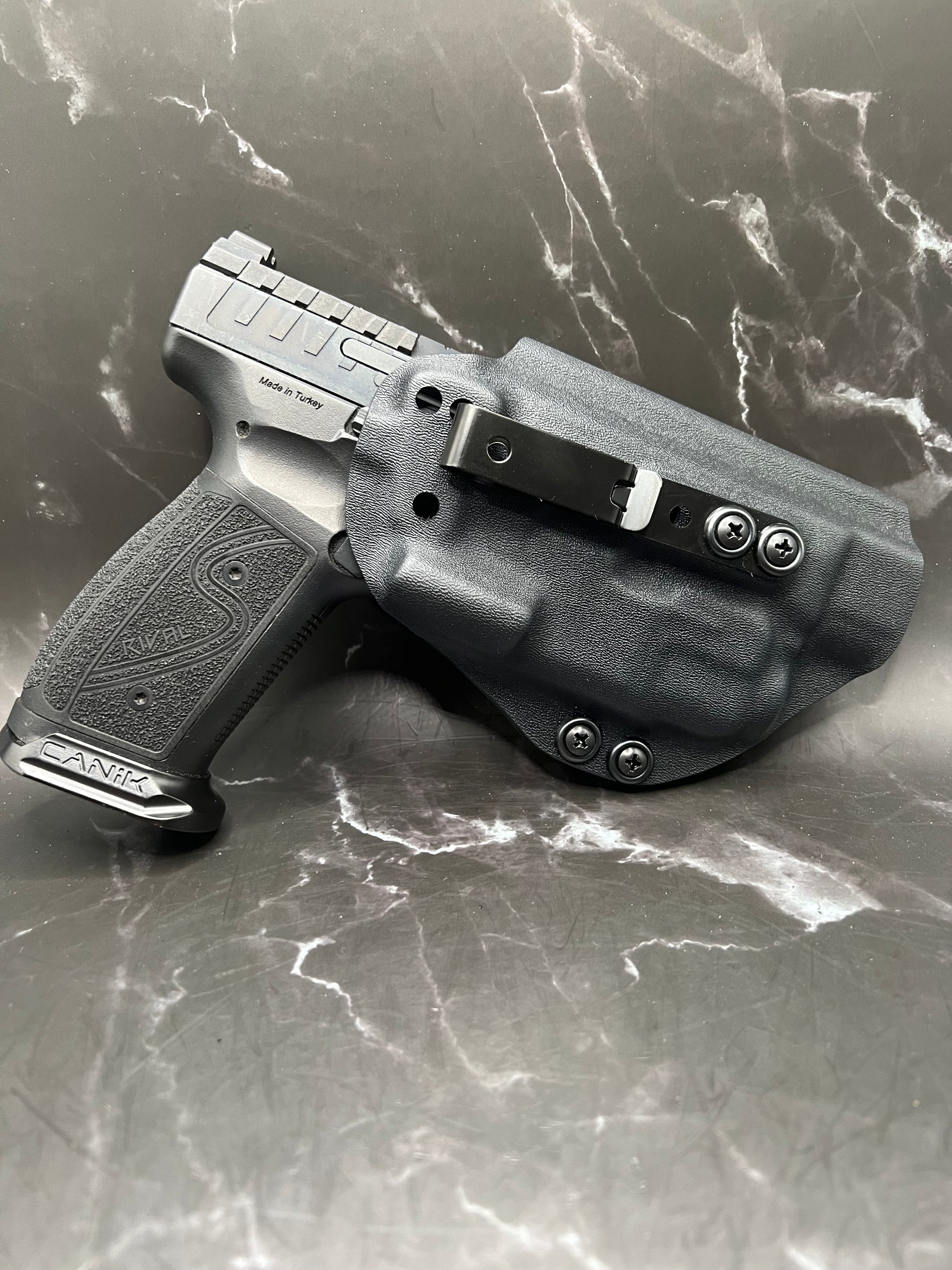 A Canik IWB Kydex holster is a holster specifically designed to fit the Canik pistol and worn inside the waistband of the pants, made from Kydex material to provide a durable and secure fit for concealed carry.