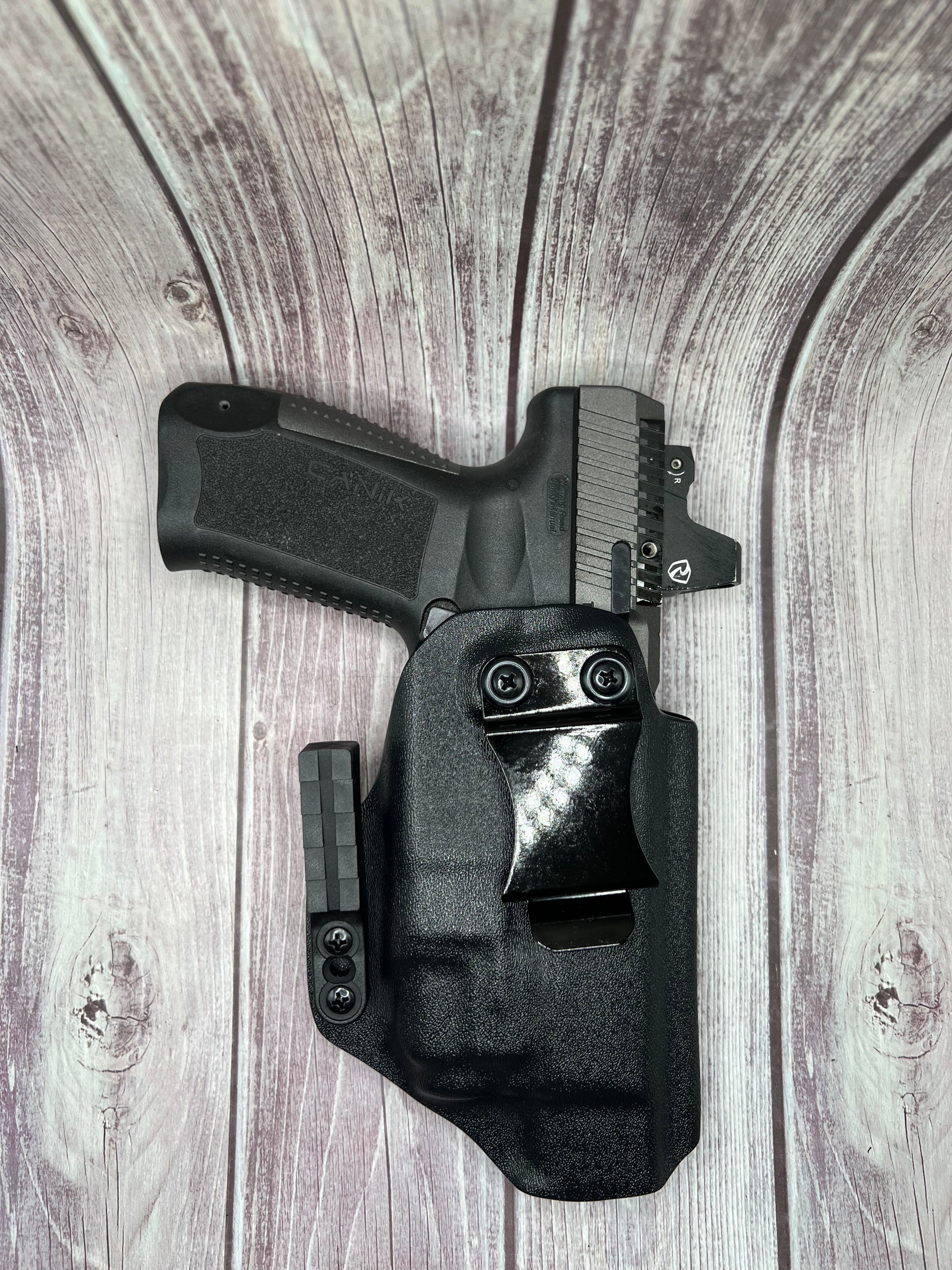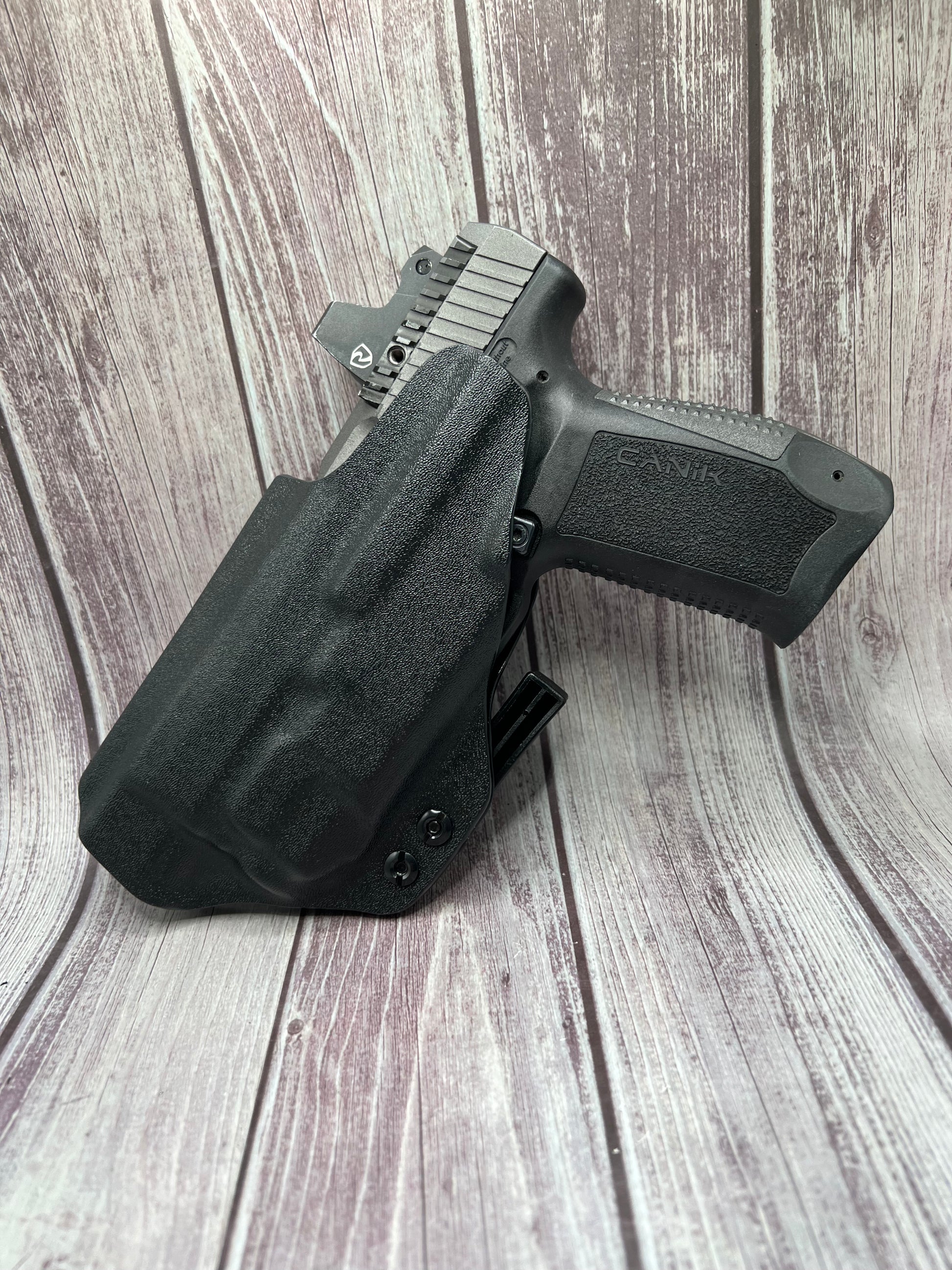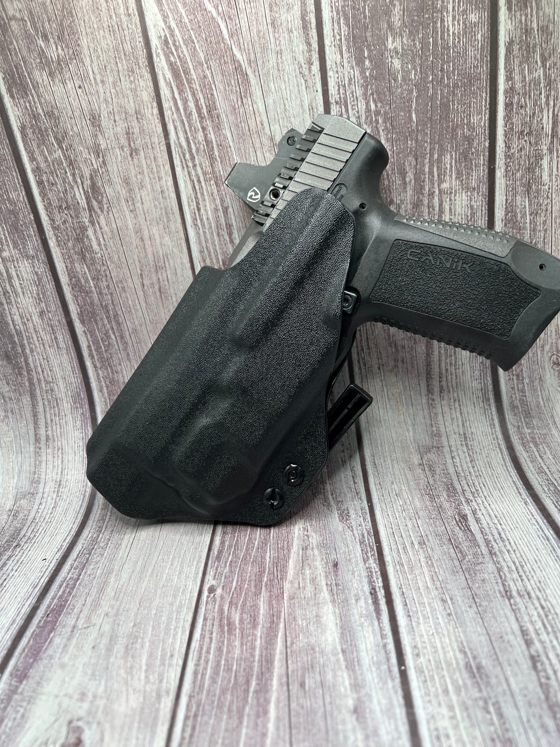 A Canik IWB Kydex holster is a holster specifically designed to fit the Canik pistol and worn inside the waistband of the pants, made from Kydex material to provide a durable and secure fit for concealed carry.
