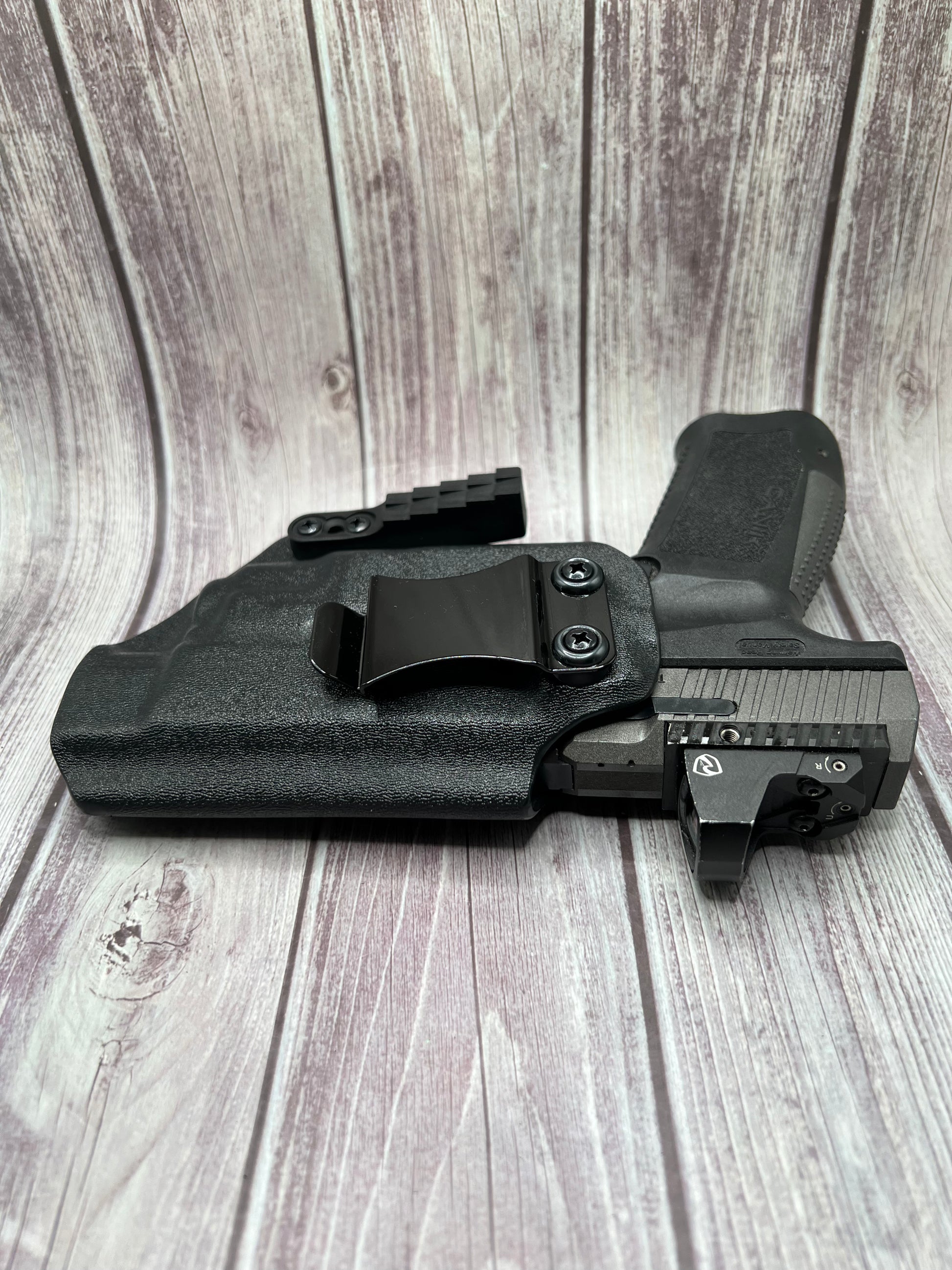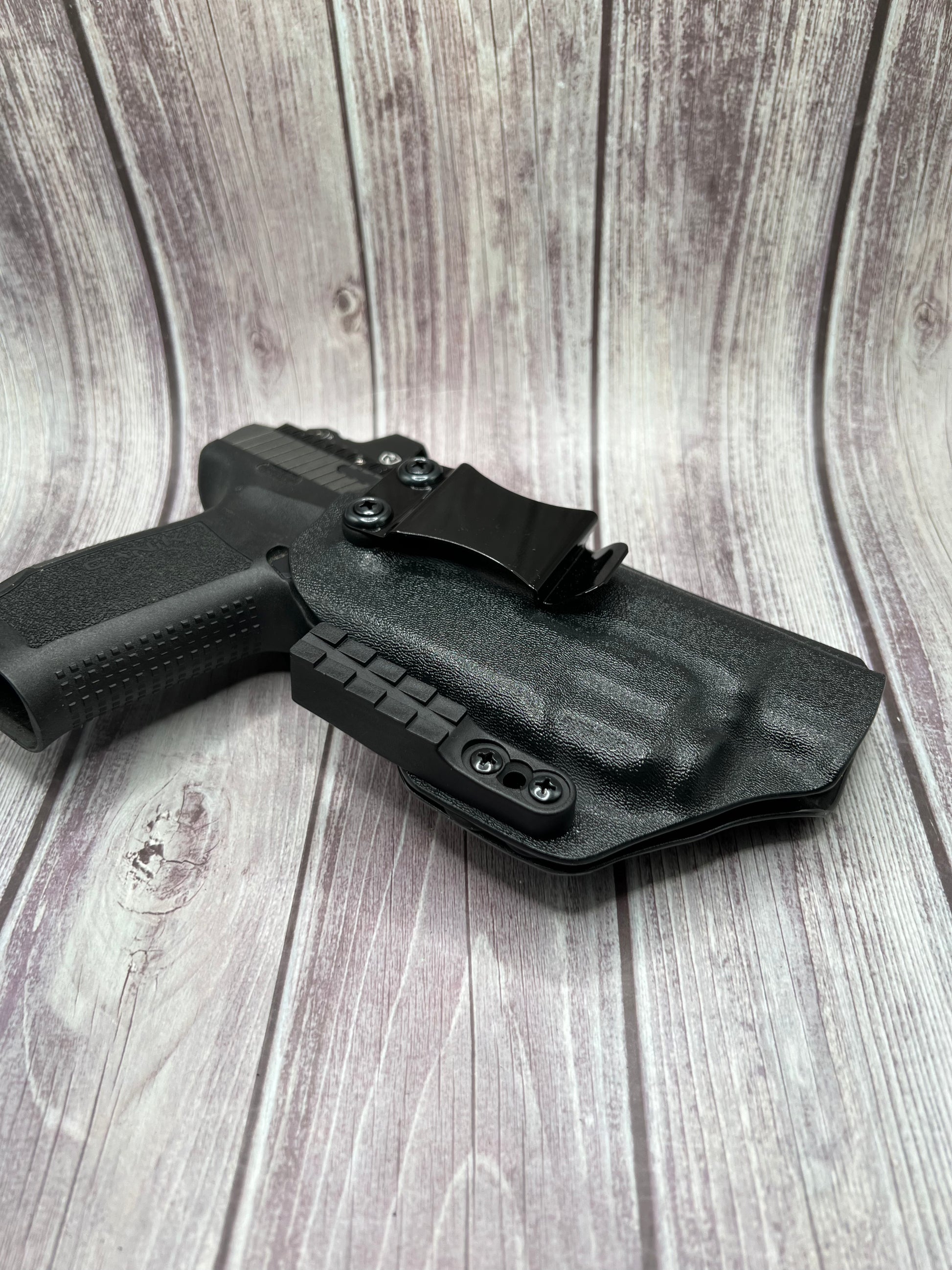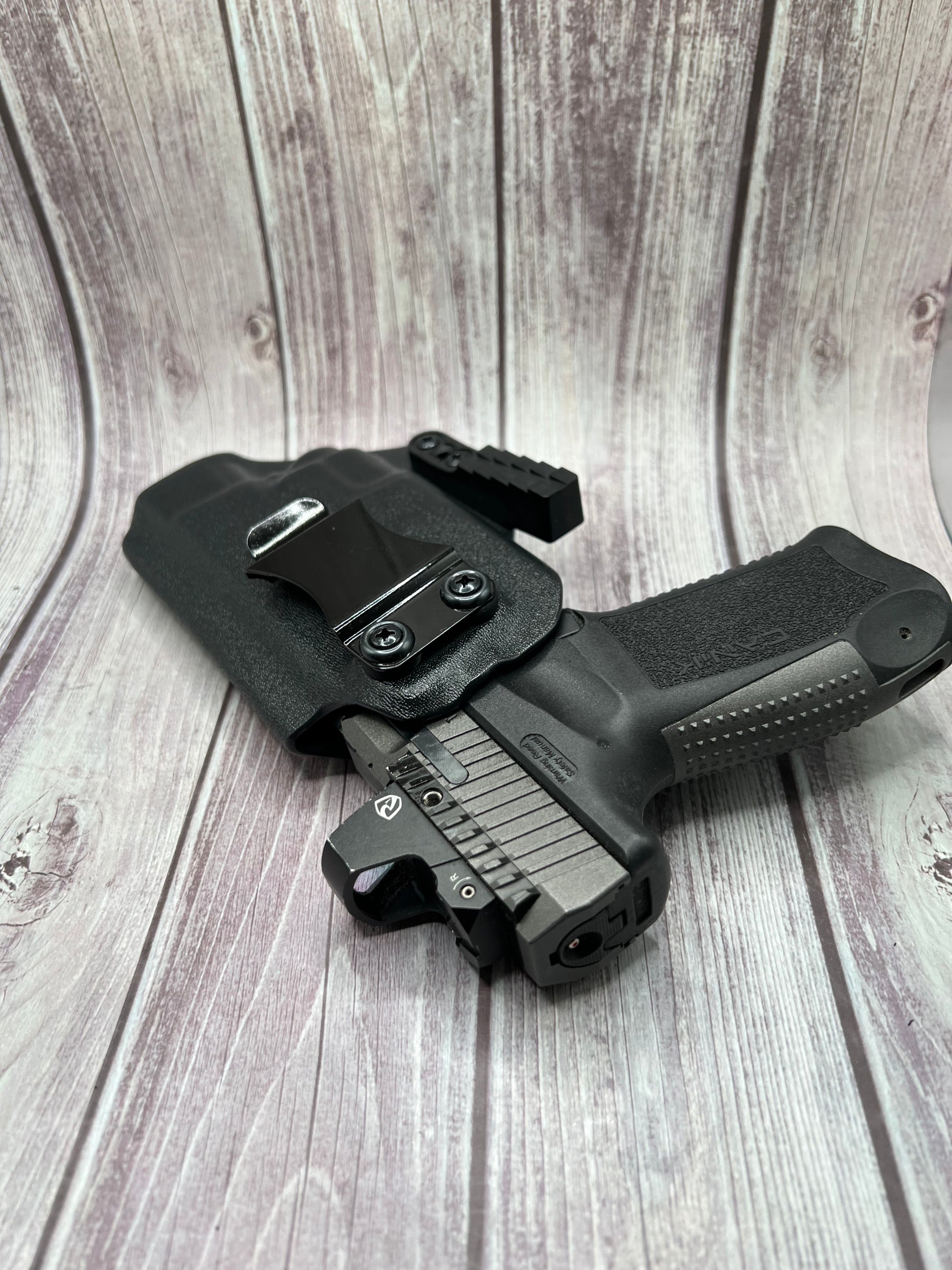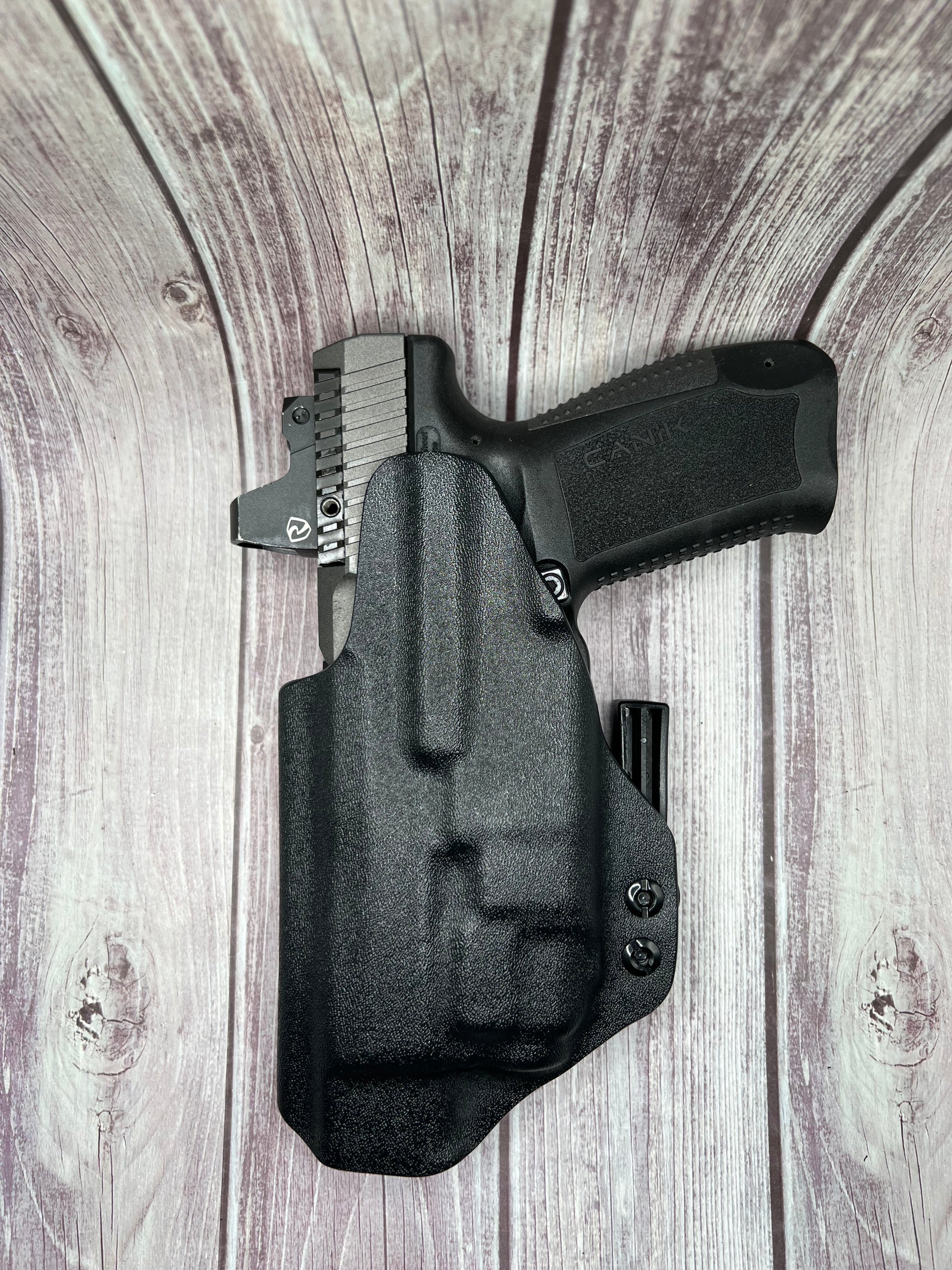 A Canik IWB Kydex holster is a holster specifically designed to fit the Canik pistol and worn inside the waistband of the pants, made from Kydex material to provide a durable and secure fit for concealed carry.