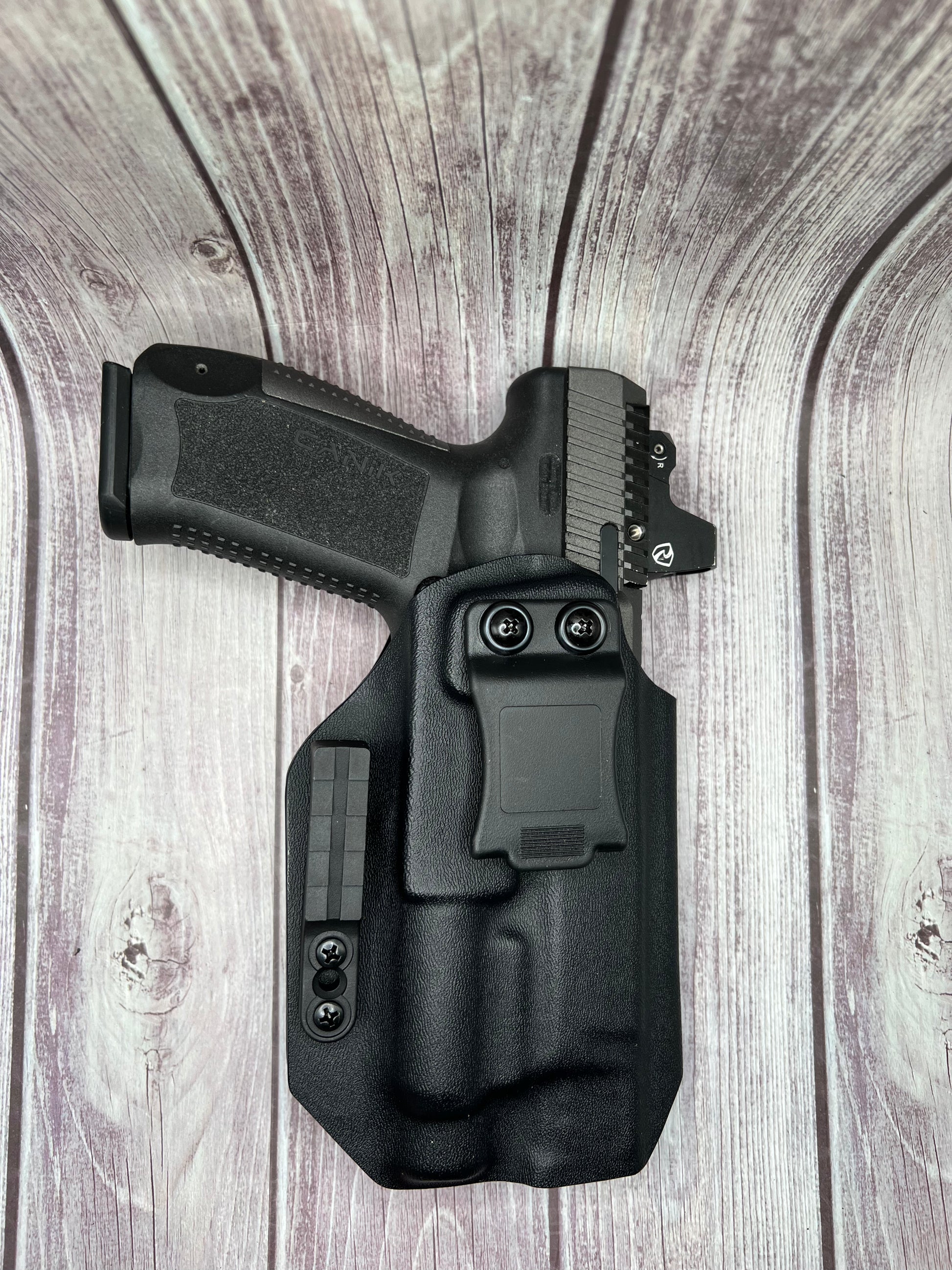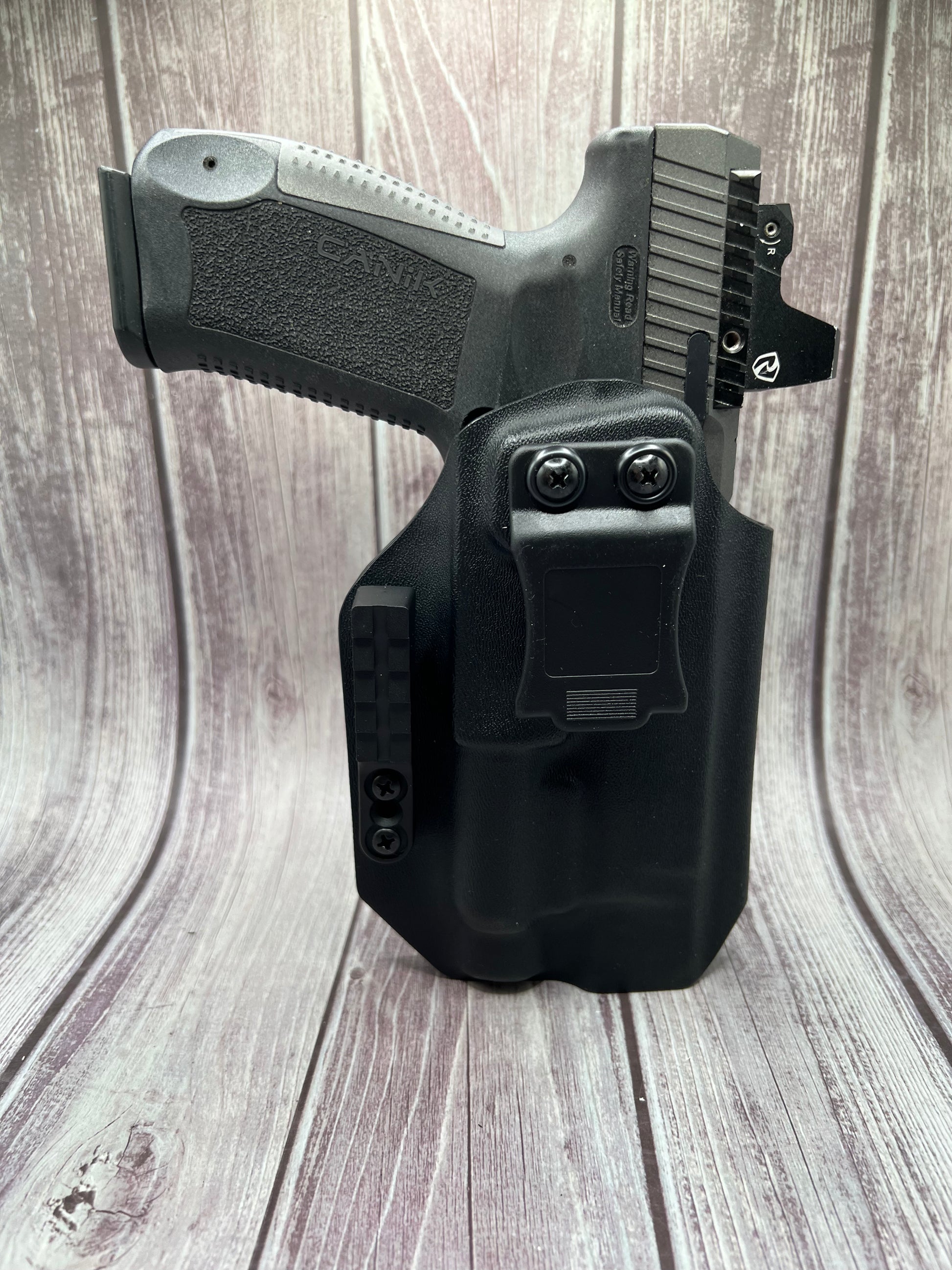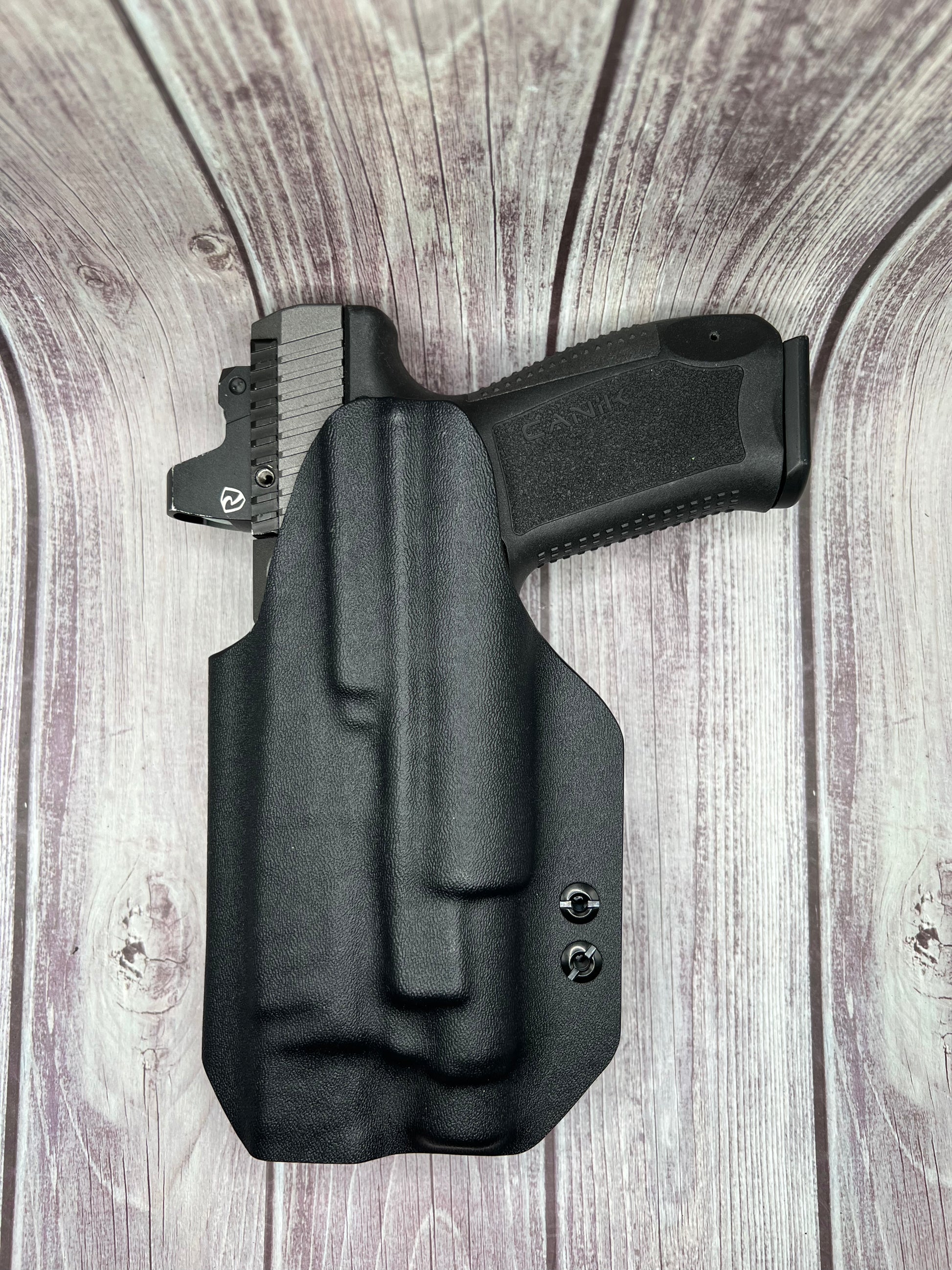 A Canik IWB Kydex holster is a holster specifically designed to fit the Canik pistol and worn inside the waistband of the pants, made from Kydex material to provide a durable and secure fit for concealed carry.