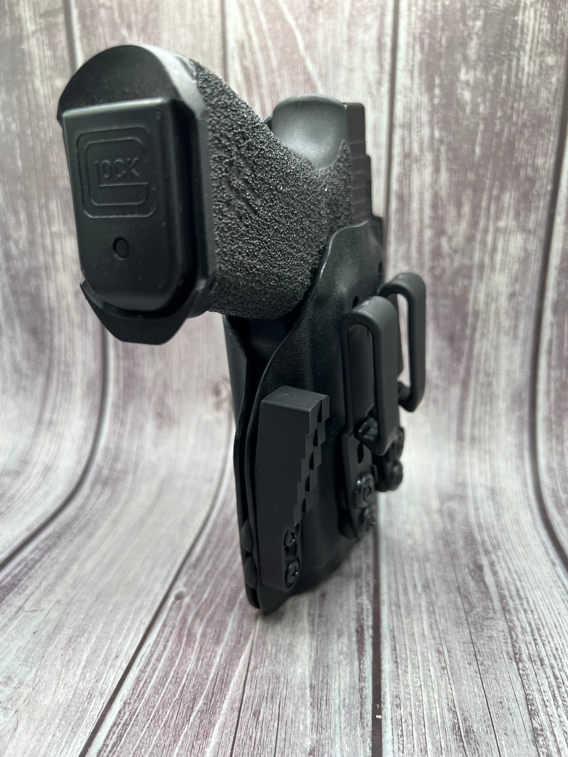 A Kydex holster is made from a thermoplastic material that is durable, lightweight, and custom-molded to fit the specific shape of the Glock . Kydex holsters are known for their durability, retention, and ease of use.