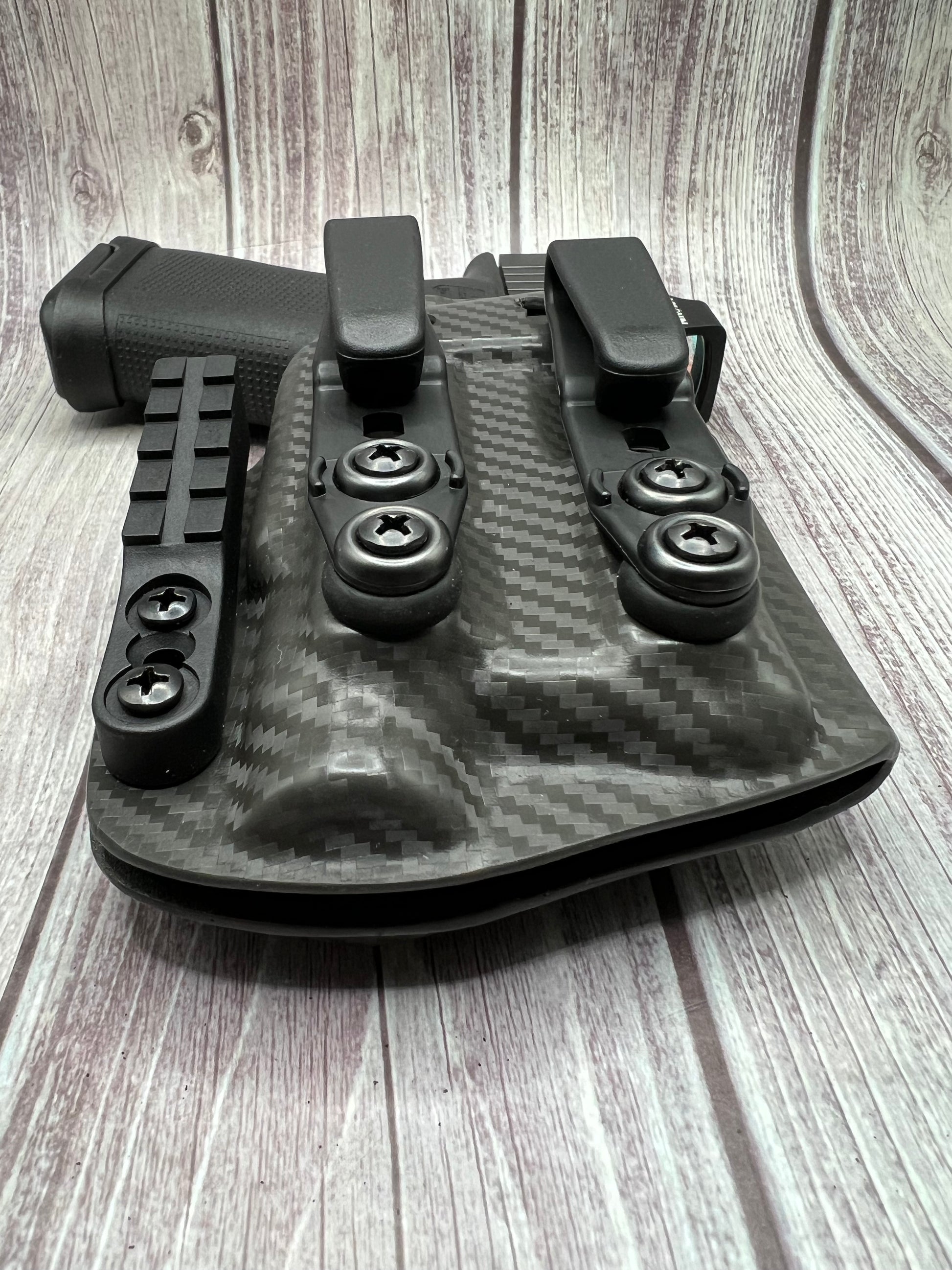 A Kydex holster is made from a thermoplastic material that is durable, lightweight, and custom-molded to fit the specific shape of the Glock 43X MOS . Kydex holsters are known for their durability, retention, and ease of use.