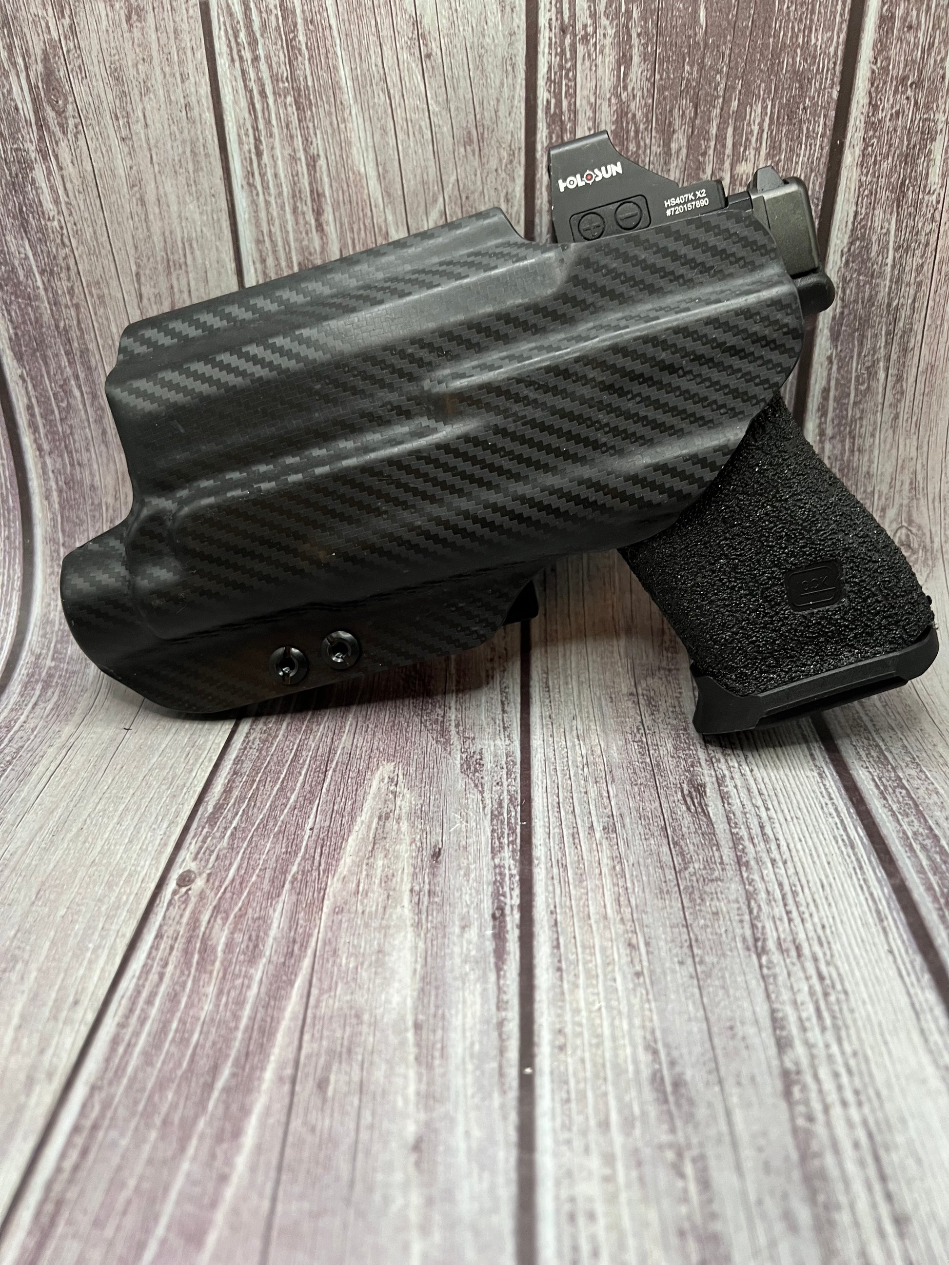 A Kydex holster is made from a thermoplastic material that is durable, lightweight, and custom-molded to fit the specific shape of the Glock. Kydex holsters are known for their durability, retention, and ease of use.