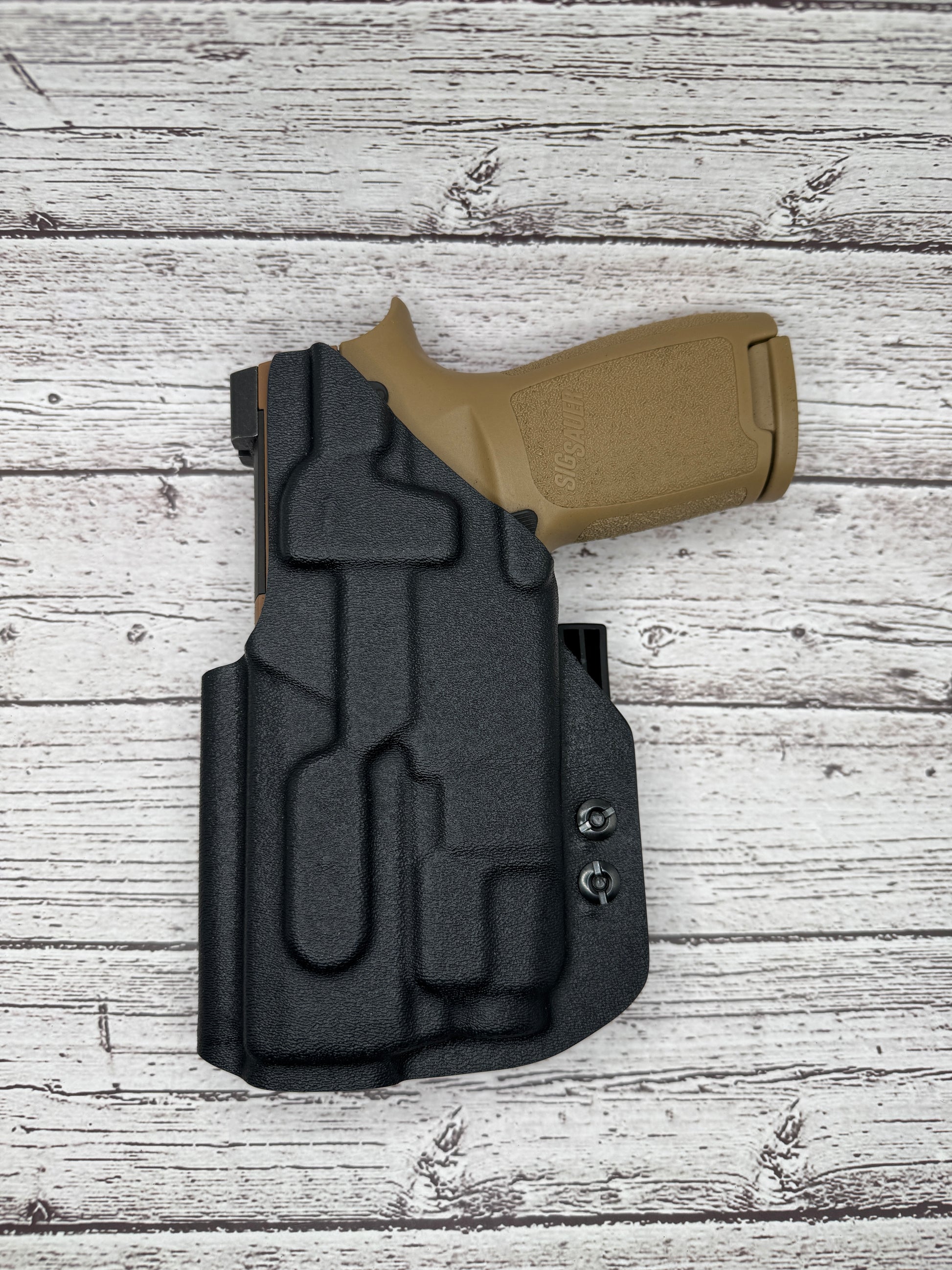 A Kydex holster is made from a thermoplastic material that is durable, lightweight, and custom-molded to fit the specific shape of the Sig sauer P320 . Kydex holsters are known for their durability, retention, and ease of use.