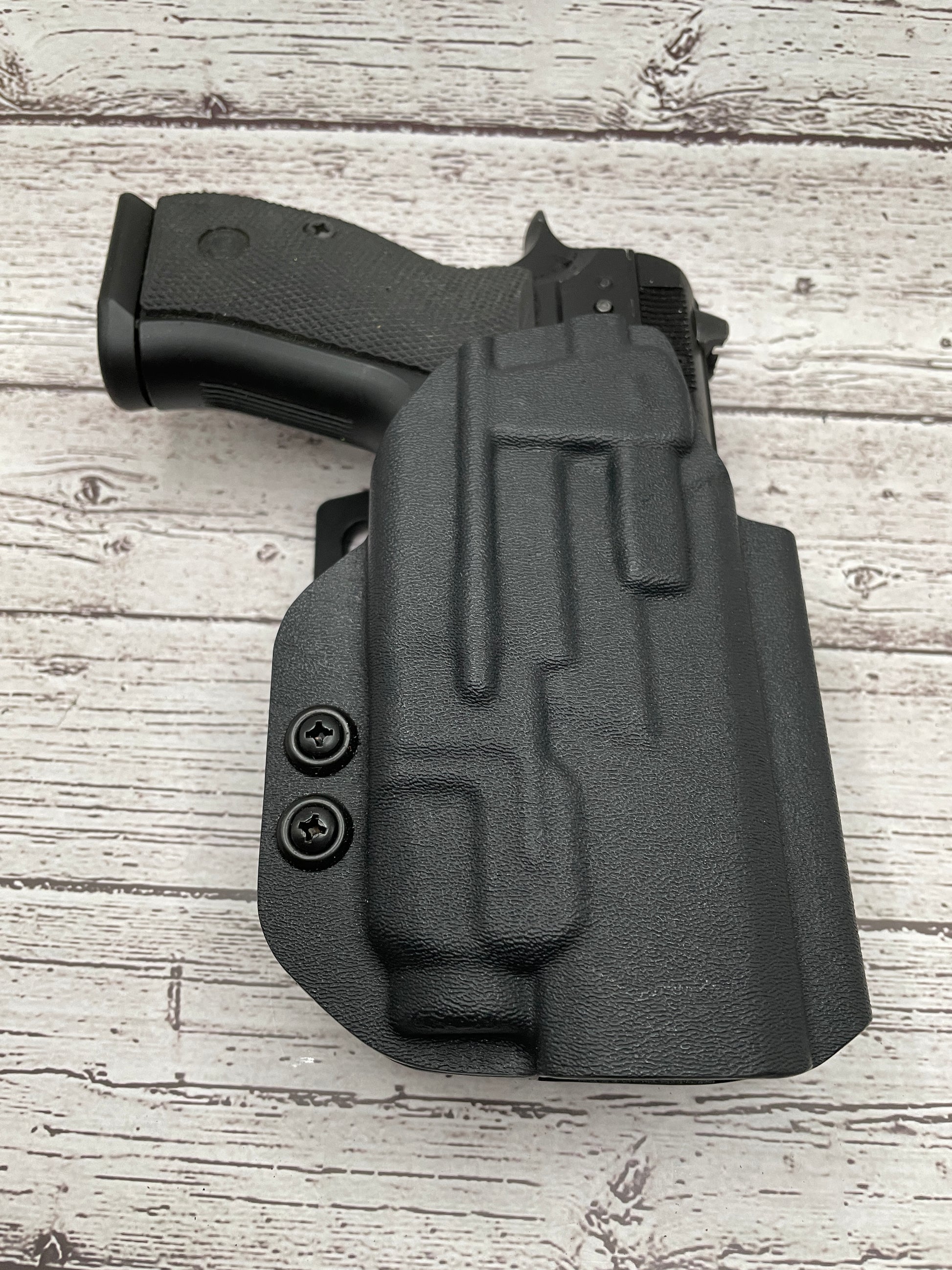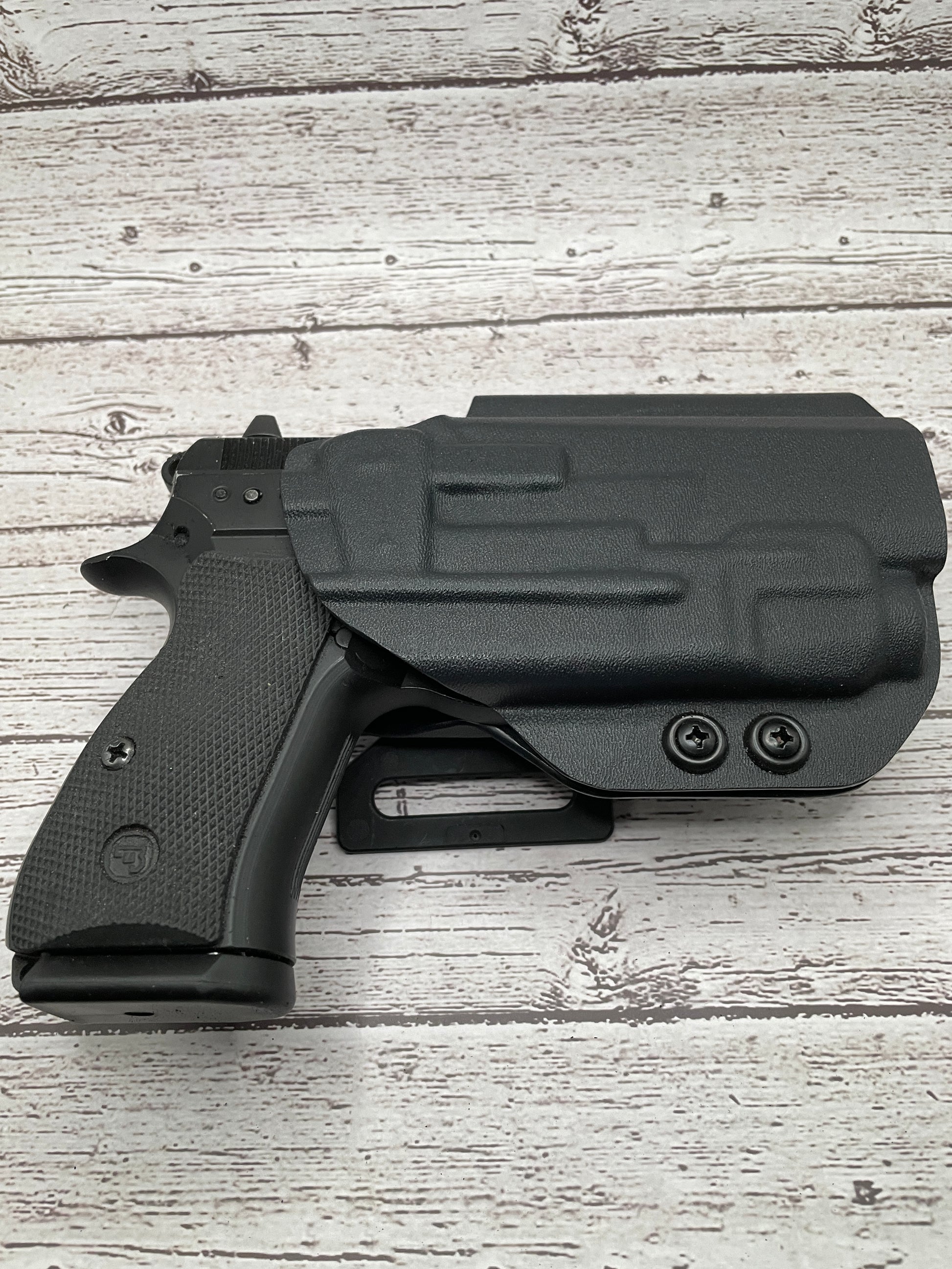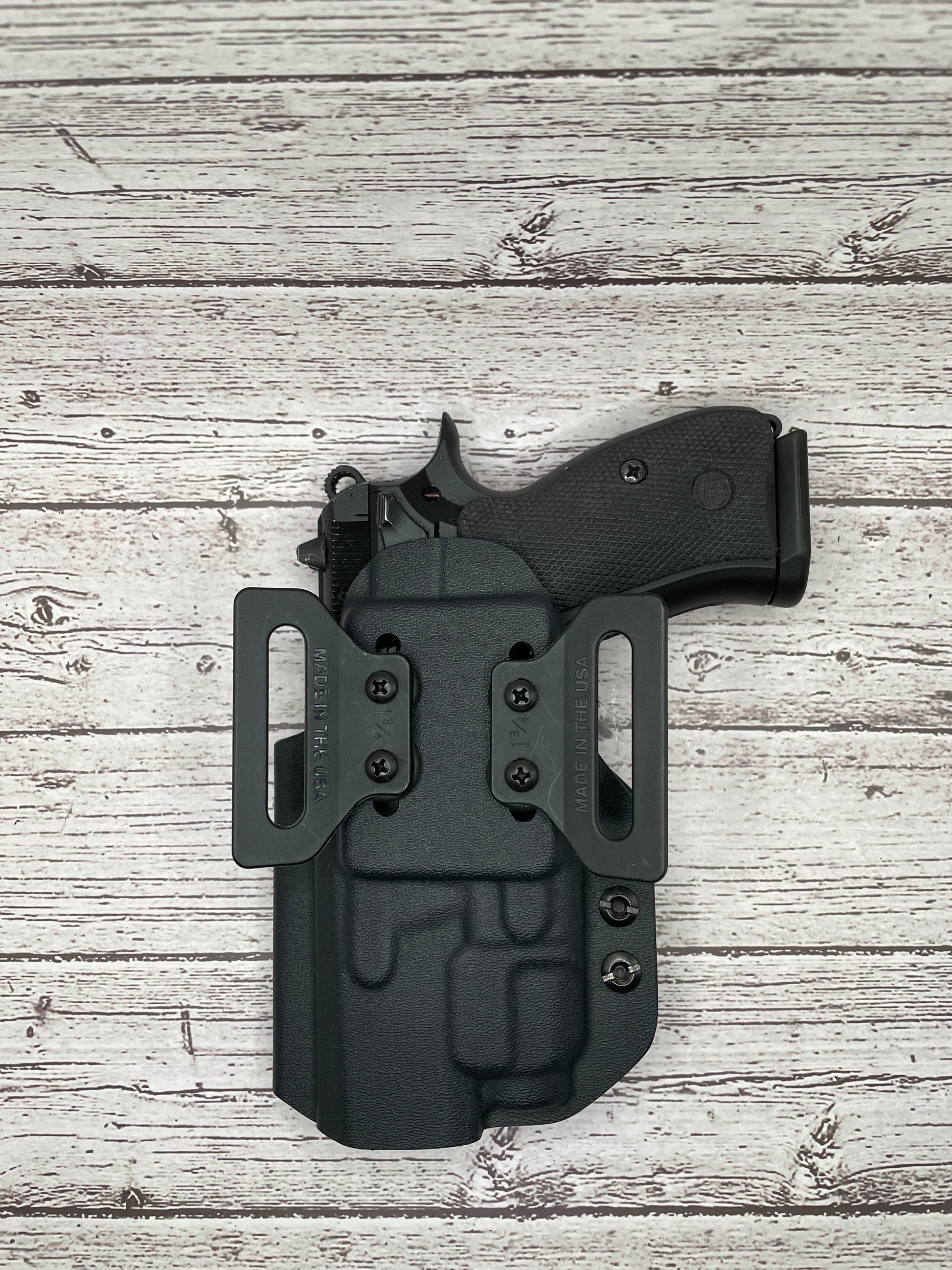 A CZ OWB Kydex holster is a holster specifically designed to fit the CZ pistol and worn outside the waistband of the pants, made from Kydex material to provide a durable and secure fit for concealed carry.