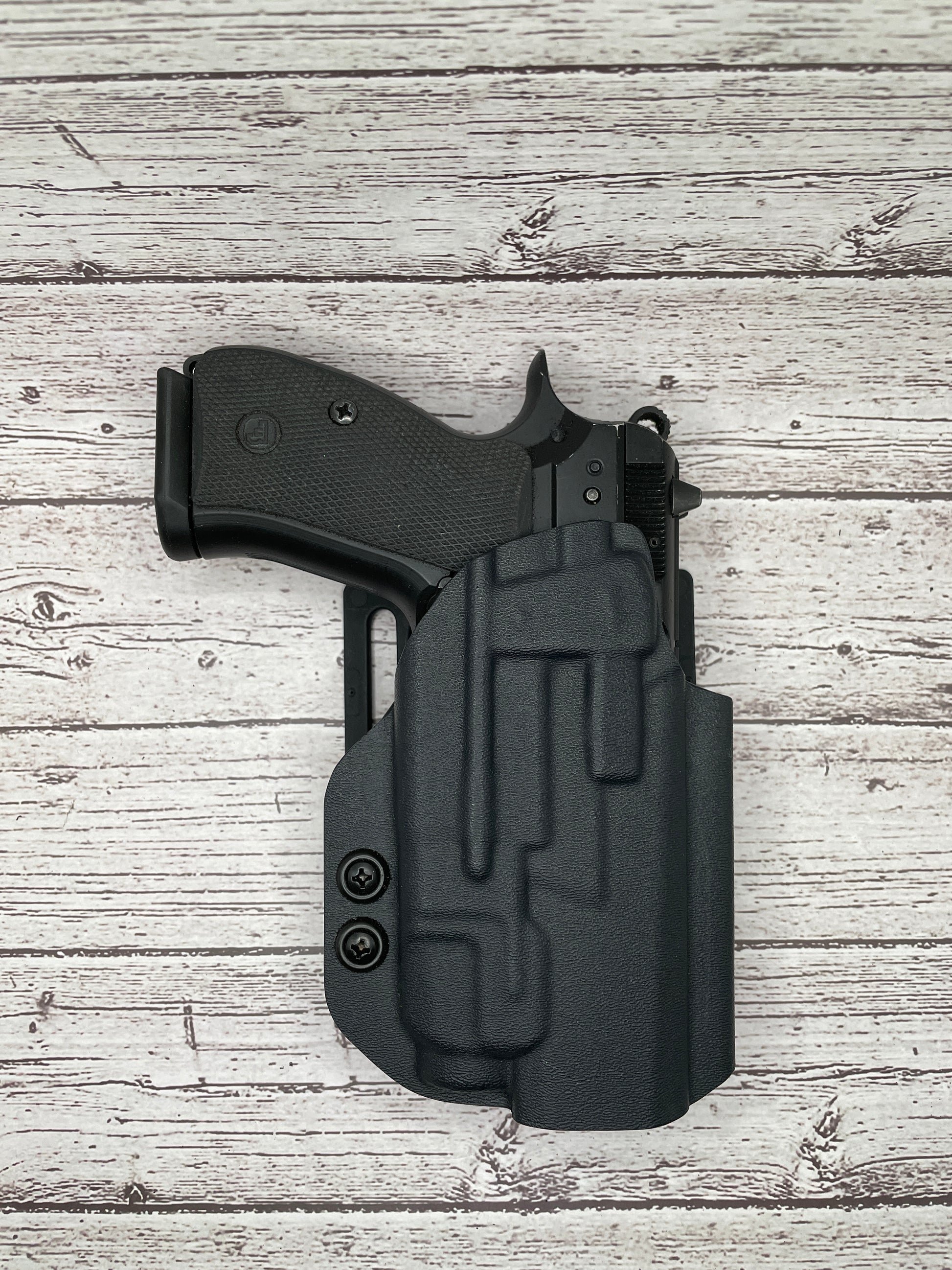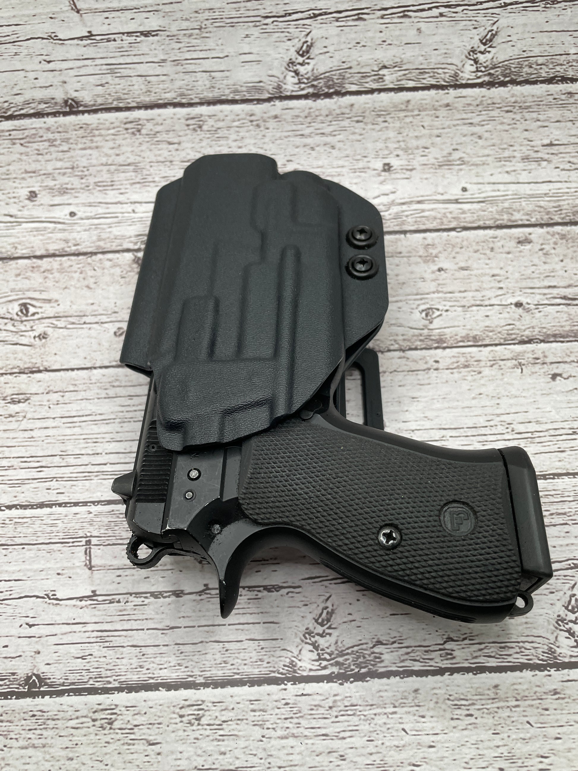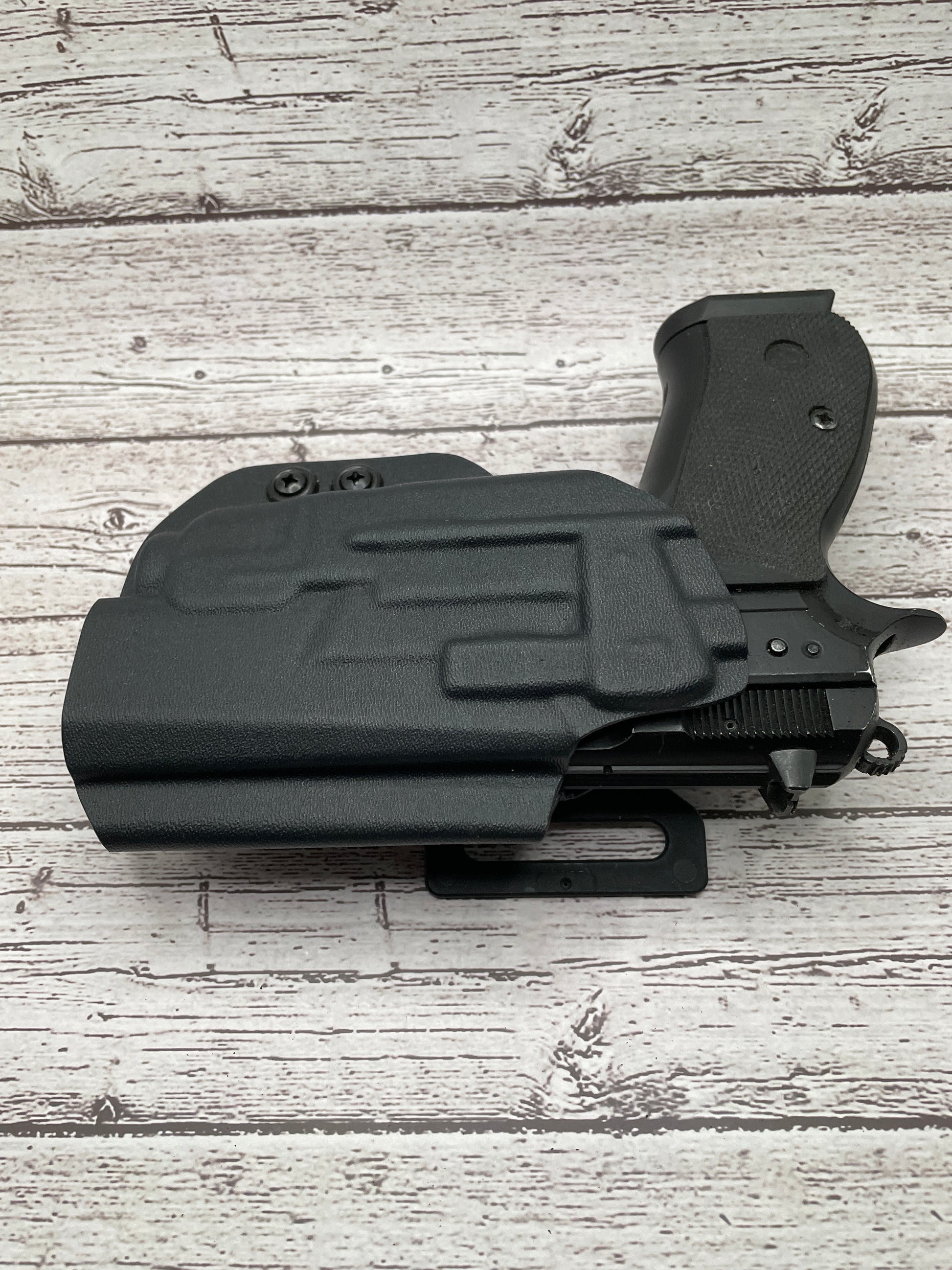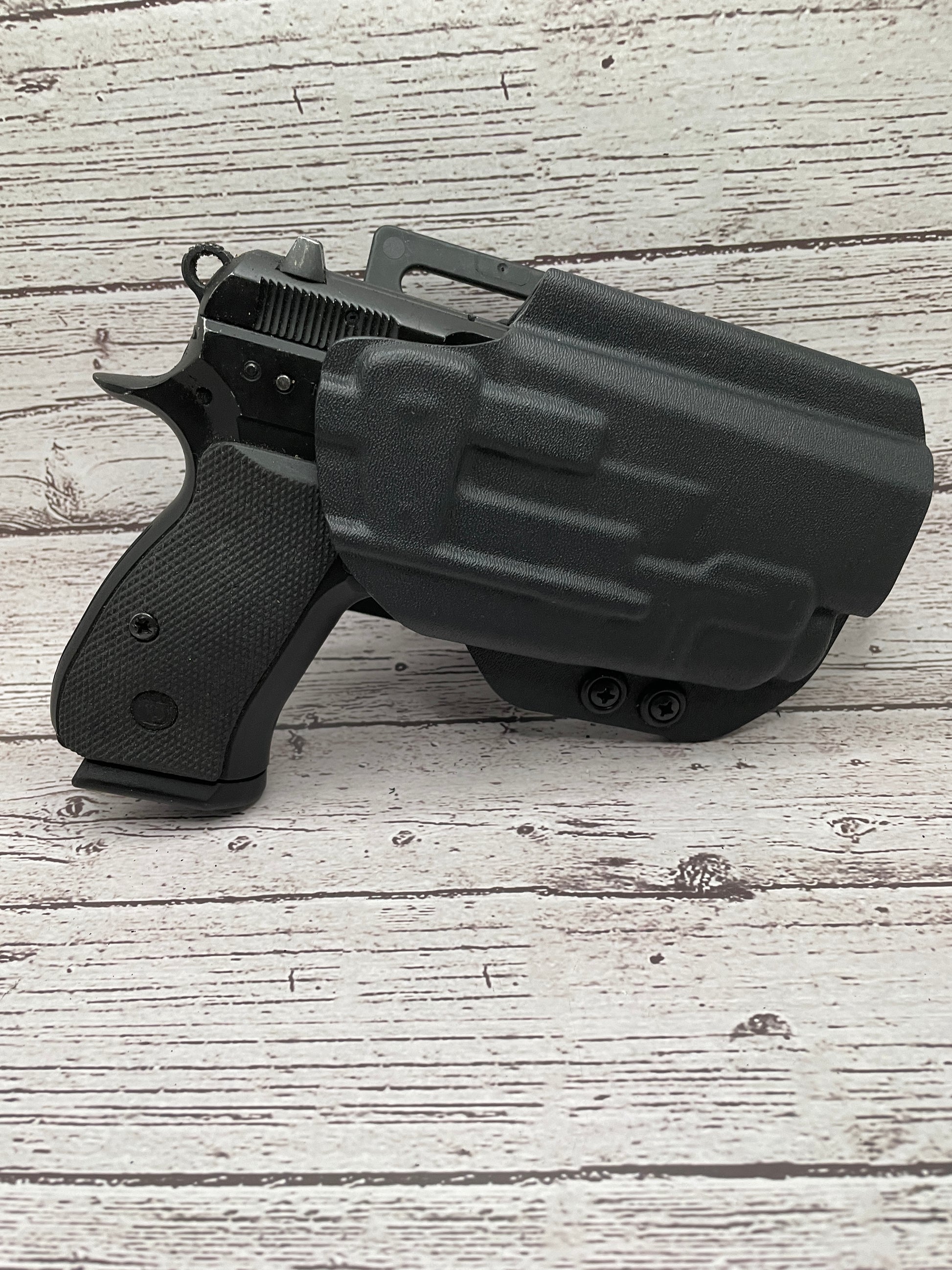 A CZ OWB Kydex holster is a holster specifically designed to fit the CZ pistol and worn outside the waistband of the pants, made from Kydex material to provide a durable and secure fit for concealed carry.